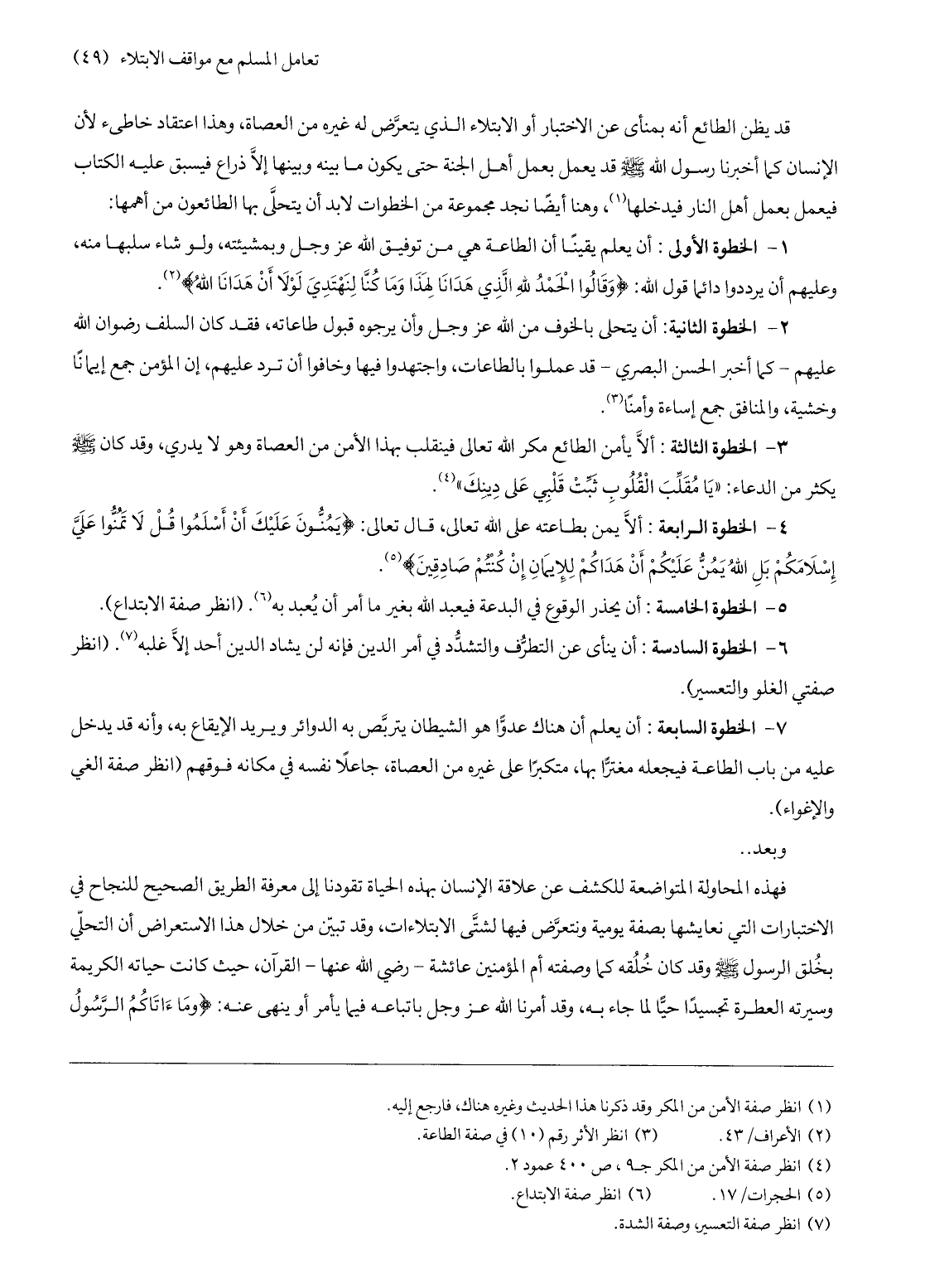 قد يظن الطائع أنه بمنأى عن الاختبار أو الابتلاء الذي يتعرّض له غيره من العصاة، وهذا اعتقاد خاطىء لأن الإنسان كما أخبرنا رسول الله صلّى الله عليه وسلّم قد يعمل بعمل أهل الجنة حتى يكون ما بينه وبينها إلّا ذراع فيسبق عليه الكتاب فيعمل بعمل أهل النار فيدخلها «1» ، وهنا أيضا نجد مجموعة من الخطوات لابد أن يتحلّى بها الطائعون من أهمها: