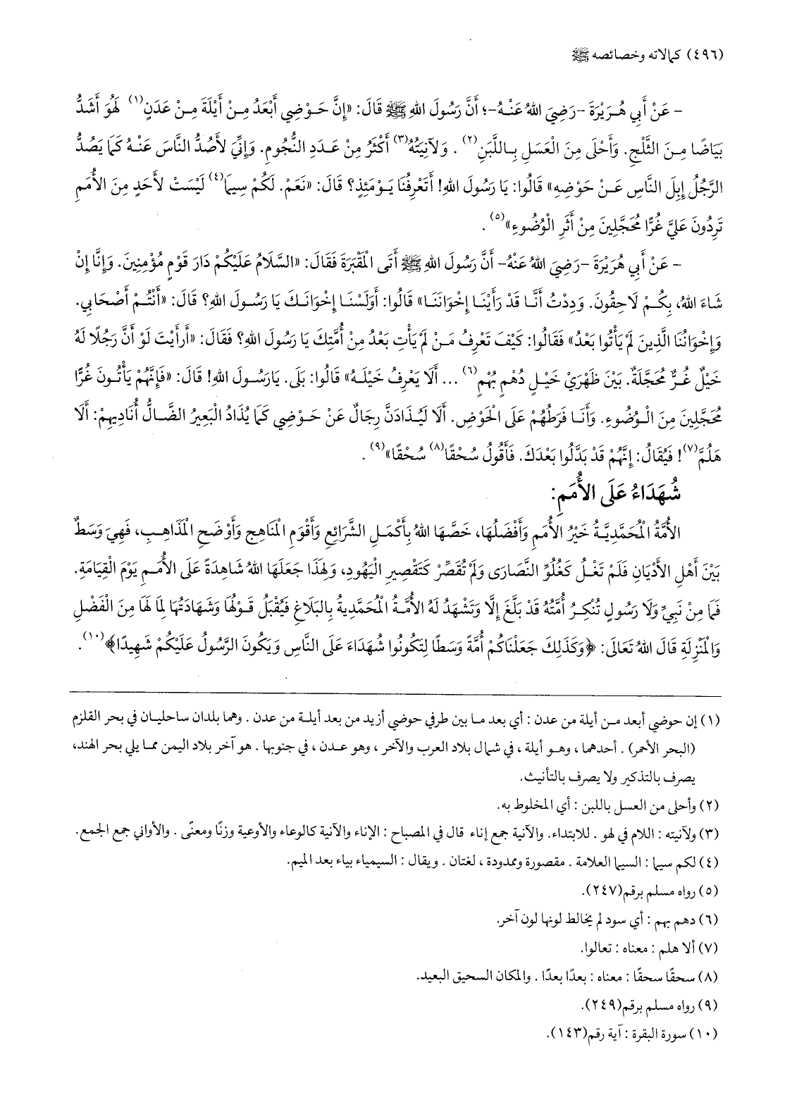 الأمّة المحمّديّة خير الأمم وأفضلها، خصّها الله بأكمل الشّرائع وأقوم المناهج وأوضح المذاهب، فهي وسط بين أهل الأديان فلم تغل كغلوّ النّصارى ولم تقصّر كتقصير اليهود، ولهذا جعلها الله شاهدة على الأمم يوم القيامة. فما من نبيّ ولا رسول تنكر أمّته قد بلّغ إلّا وتشهد له الأمّة المحمّدية بالبلاغ فيقبل قولها وشهادتها لما لها من الفضل والمنزلة قال الله تعالى: وَكَذلِكَ جَعَلْناكُمْ أُمَّةً وَسَطاً لِتَكُونُوا شُهَداءَ عَلَى النَّاسِ وَيَكُونَ الرَّسُولُ عَلَيْكُمْ شَهِيداً «10» .