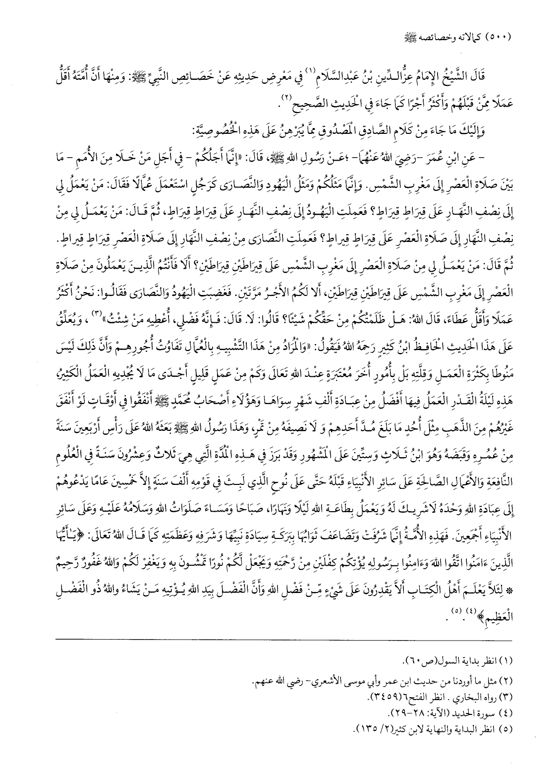 قال الشّيخ الإمام عزّ الدّين بن عبد السّلام «1» في معرض حديثه عن خصائص النّبيّ صلّى الله عليه وسلّم: ومنها أنّ أمّته أقلّ عملا ممّن قبلهم وأكثر أجرا كما جاء في الحديث الصّحيح «2» .
