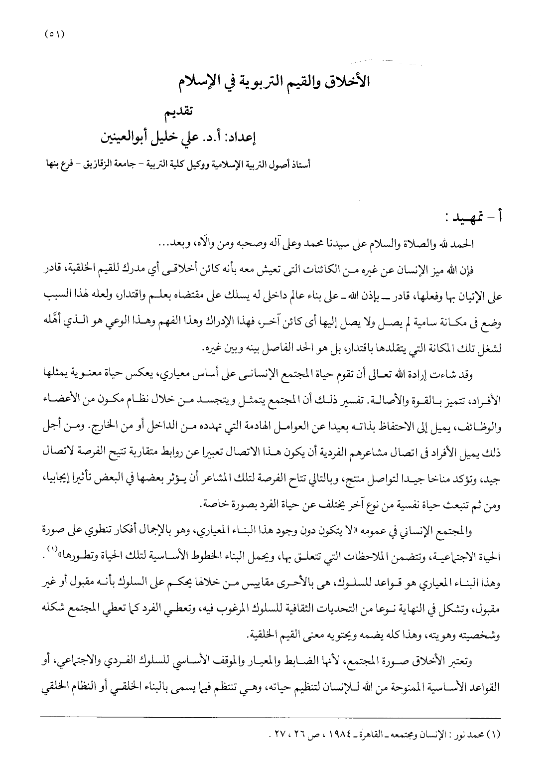 (1) محمد نور: الإنسان ومجتمعه- القاهرة- 1984، ص 26، 27.