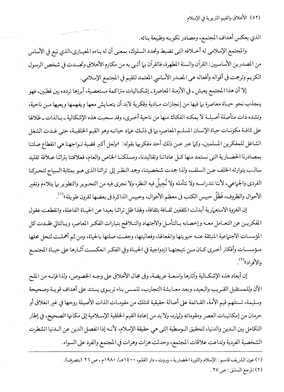 (1) عون الشريف قاسم: الإسلام والثورة الحضارية، بيروت، دار القلم، 1400 هـ/ 1980 م، ص 26 (بتصرف) .