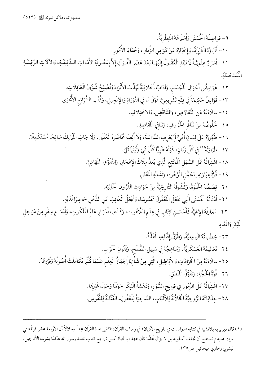 (1) قال ديزيريه بلا نشيه في كتابه «دراسات في تاريخ الأديان» في وصف القرآن: «كفى هذا القرآن مجدا وجلالا أن الأربعة عشر قرنا التي مرت عليه لم تستطع أن تجفف أسلوبه بل لا يزال غضّا كأن عهده بالحياة أمس (راجع كتاب محمد رسول الله هكذا بشرت الأناجيل. لبشري زخاري ميخائيل ص 35) .