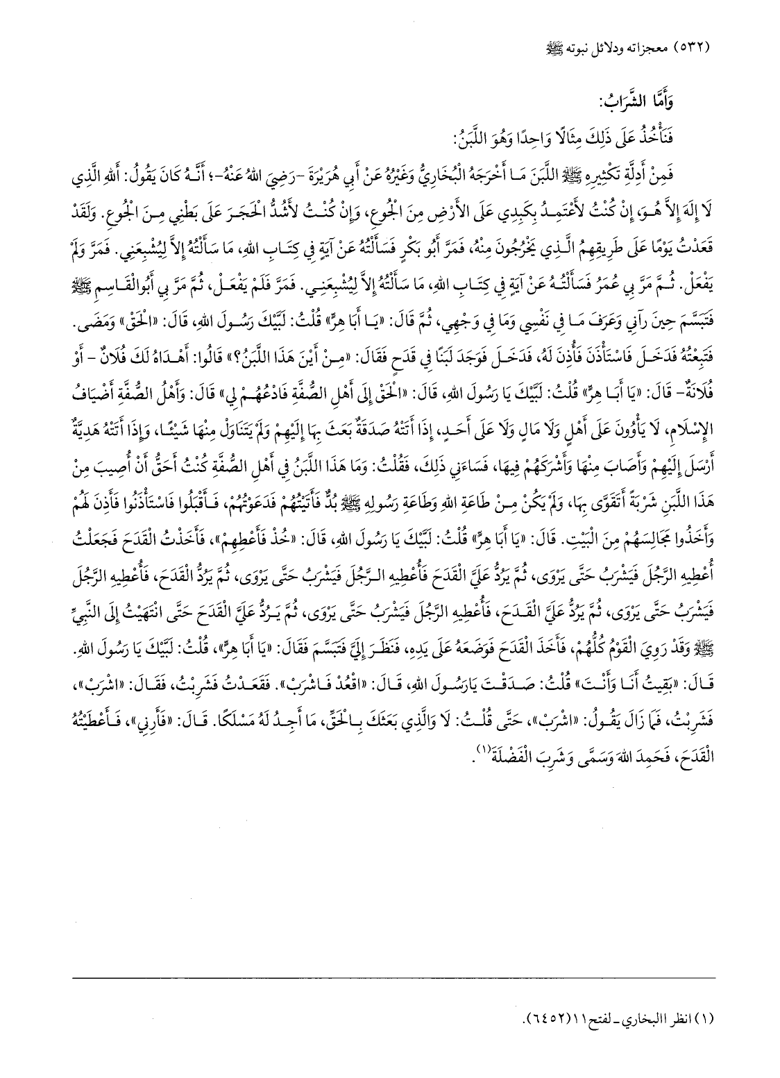 فمن أدلّة تكثيره صلّى الله عليه وسلّم اللّبن ما أخرجه البخاريّ وغيره عن أبي هريرة- رضي الله عنه-؛ أنّه كان يقول: الله الّذي لا إله إلّا هو، إن كنت لأعتمد بكبدي على الأرض من الجوع، وإن كنت لأشدّ الحجر على بطني من الجوع.