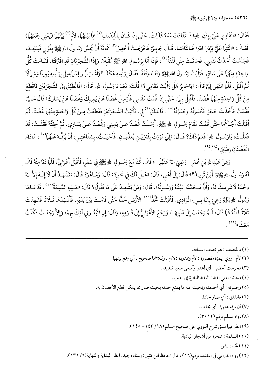 فقال: «انقادي عليّ بإذن الله» فانقادت معه كذلك. حتّى إذا كان بالمنصف «1» ممّا بينهما، لأم «2» بينهما (يعني جمعهما) فقال: «التئما عليّ بإذن الله» فالتأمتا. قال جابر: فخرجت أحضر «3» مخافة أن يحسّ رسول الله صلّى الله عليه وسلّم بقربي فيبتعد، فجلست أحدّث نفسي. فحانت منّي لفتة «4» ، فإذا أنا برسول الله صلّى الله عليه وسلّم مقبلا. وإذا الشّجرتان قد افترقتا.