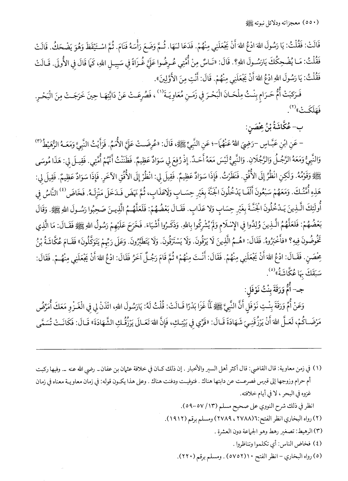 (يشكّ أيّهما قال) . قالت: فقلت: يا رسول الله ادع الله أن يجعلني منهم. فدعا لها. ثمّ وضع رأسه فنام. ثمّ استيقظ وهو يضحك. قالت فقلت: ما يضحكك يا رسول الله؟. قال: «ناس من أمّتي عرضوا عليّ غزاة في سبيل الله، كما قال في الأولى. قالت فقلت: يا رسول الله ادع الله أن يجعلني منهم. قال: أنت من الأوّلين» .