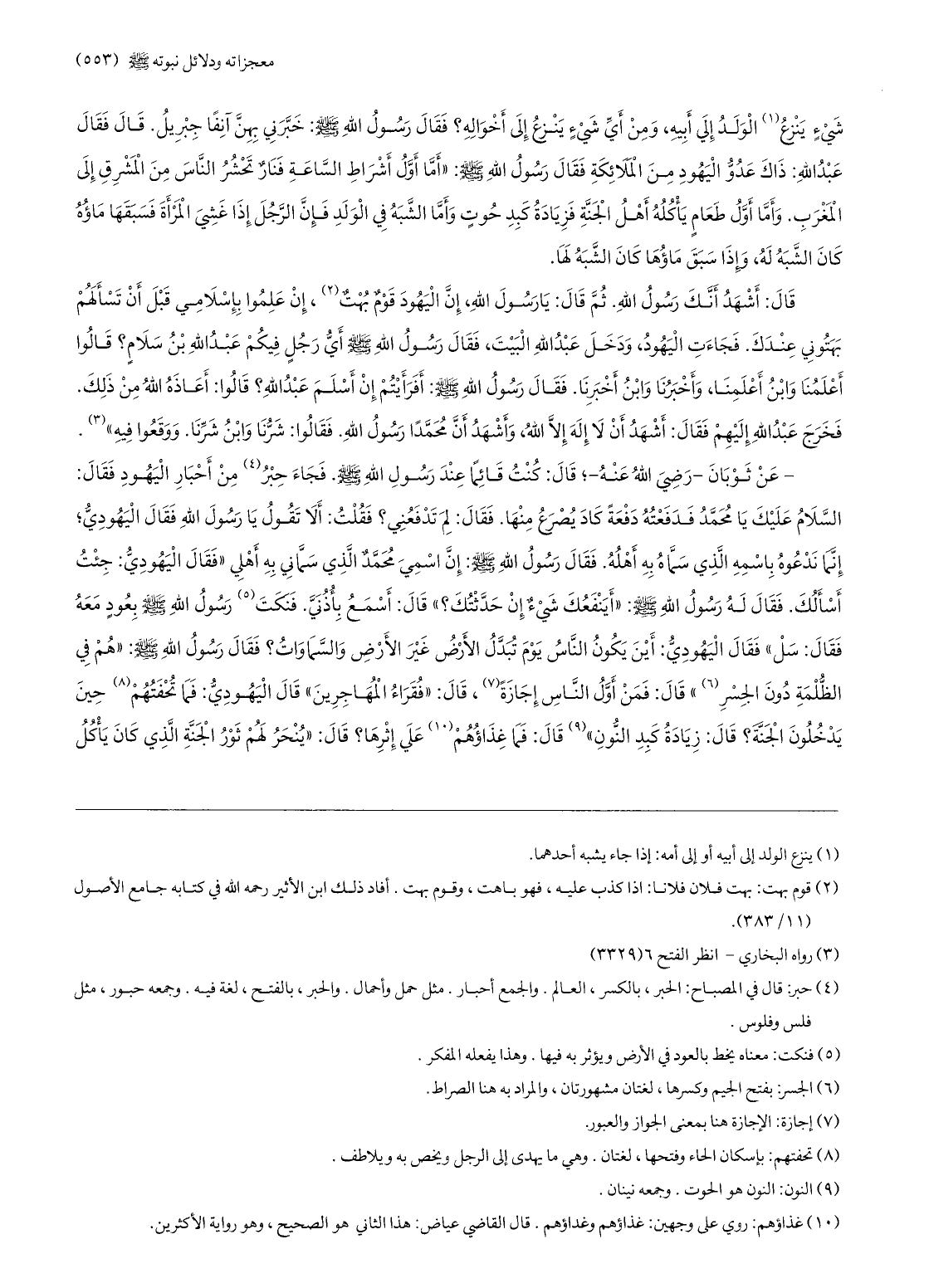- عن ثوبان- رضي الله عنه-؛ قال: كنت قائما عند رسول الله صلّى الله عليه وسلّم. فجاء حبر «4» من أحبار اليهود فقال: