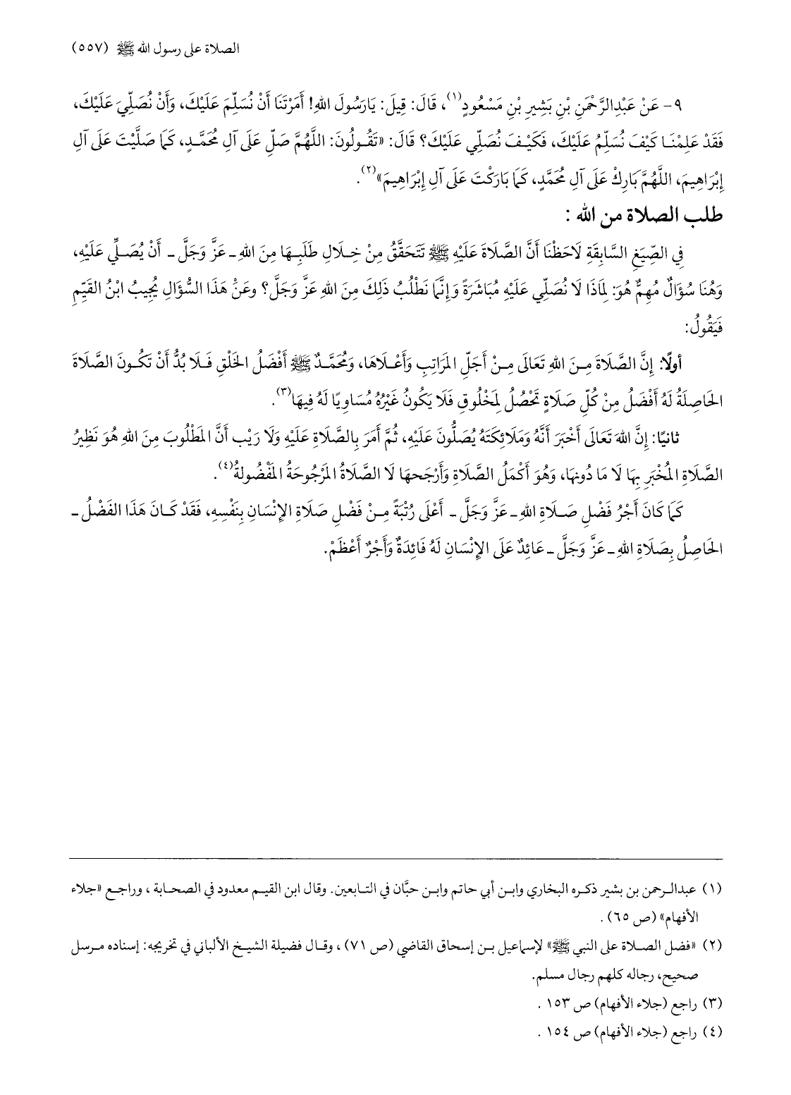 9- عن عبد الرّحمن بن بشير بن مسعود «1» ، قال: قيل: يا رسول الله! أمرتنا أن نسلّم عليك، وأن نصلّي عليك، فقد علمنا كيف نسلّم عليك، فكيف نصلّي عليك؟ قال: «تقولون: اللهمّ صلّ على آل محمّد، كما صلّيت على آل إبراهيم، اللهمّ بارك على آل محمّد، كما باركت على آل إبراهيم» «2» .