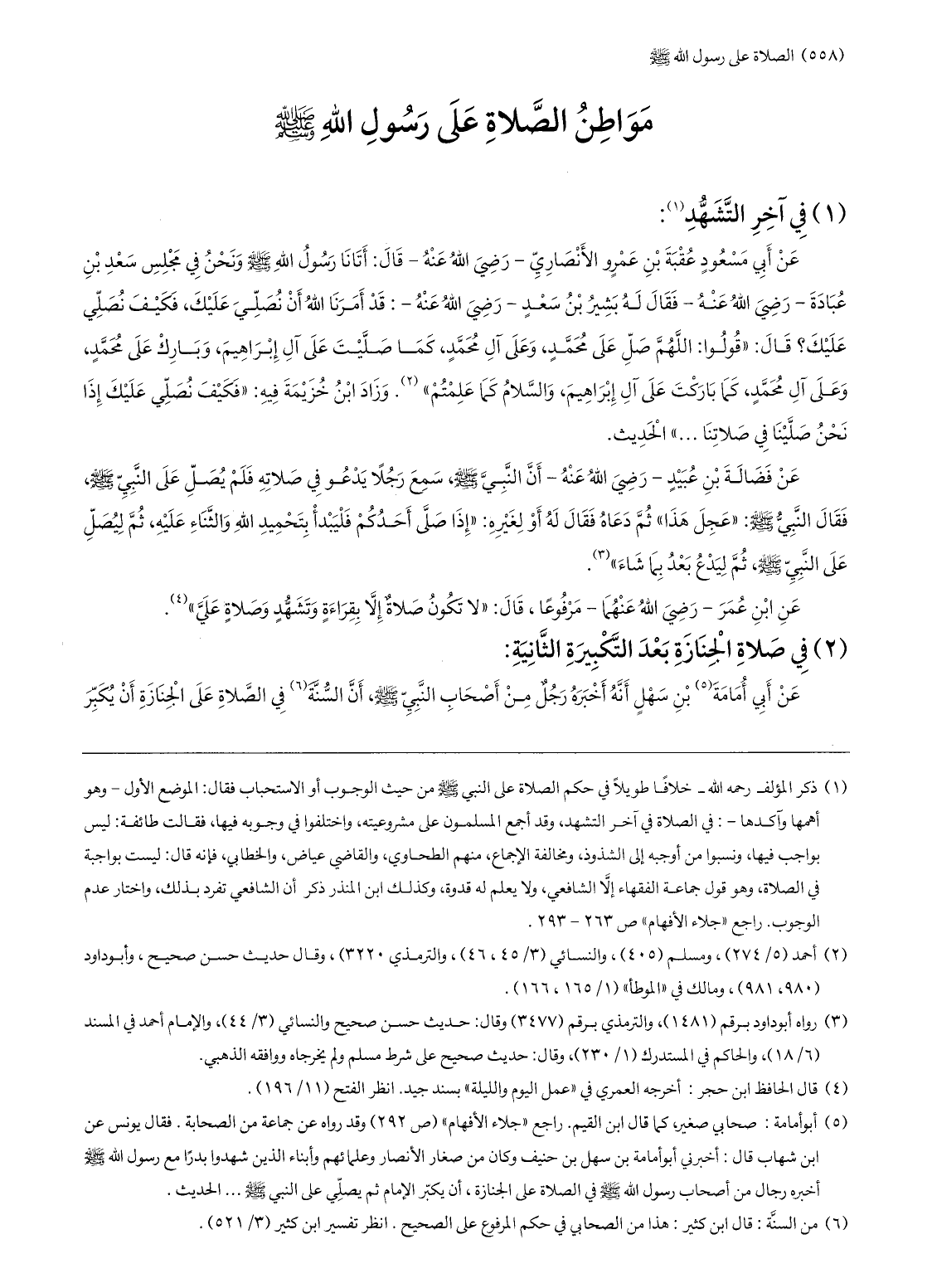 (1) ذكر المؤلف رحمه الله- خلافا طويلا في حكم الصلاة على النبي صلّى الله عليه وسلّم من حيث الوجوب أو الاستحباب فقال: الموضع الأول- وهو أهمها وآكدها-: في الصلاة في آخر التشهد، وقد أجمع المسلمون على مشروعيته، واختلفوا في وجوبه فيها، فقالت طائفة: ليس بواجب فيها، ونسبوا من أوجبه إلى الشذوذ، ومخالفة الإجماع، منهم الطحاوي، والقاضي عياض، والخطابي، فإنه قال: ليست بواجبة في الصلاة، وهو قول جماعة الفقهاء إلّا الشافعي، ولا يعلم له قدوة، وكذلك ابن المنذر ذكر أن الشافعي تفرد بذلك، واختار عدم الوجوب. راجع «جلاء الأفهام» ص 263- 293.