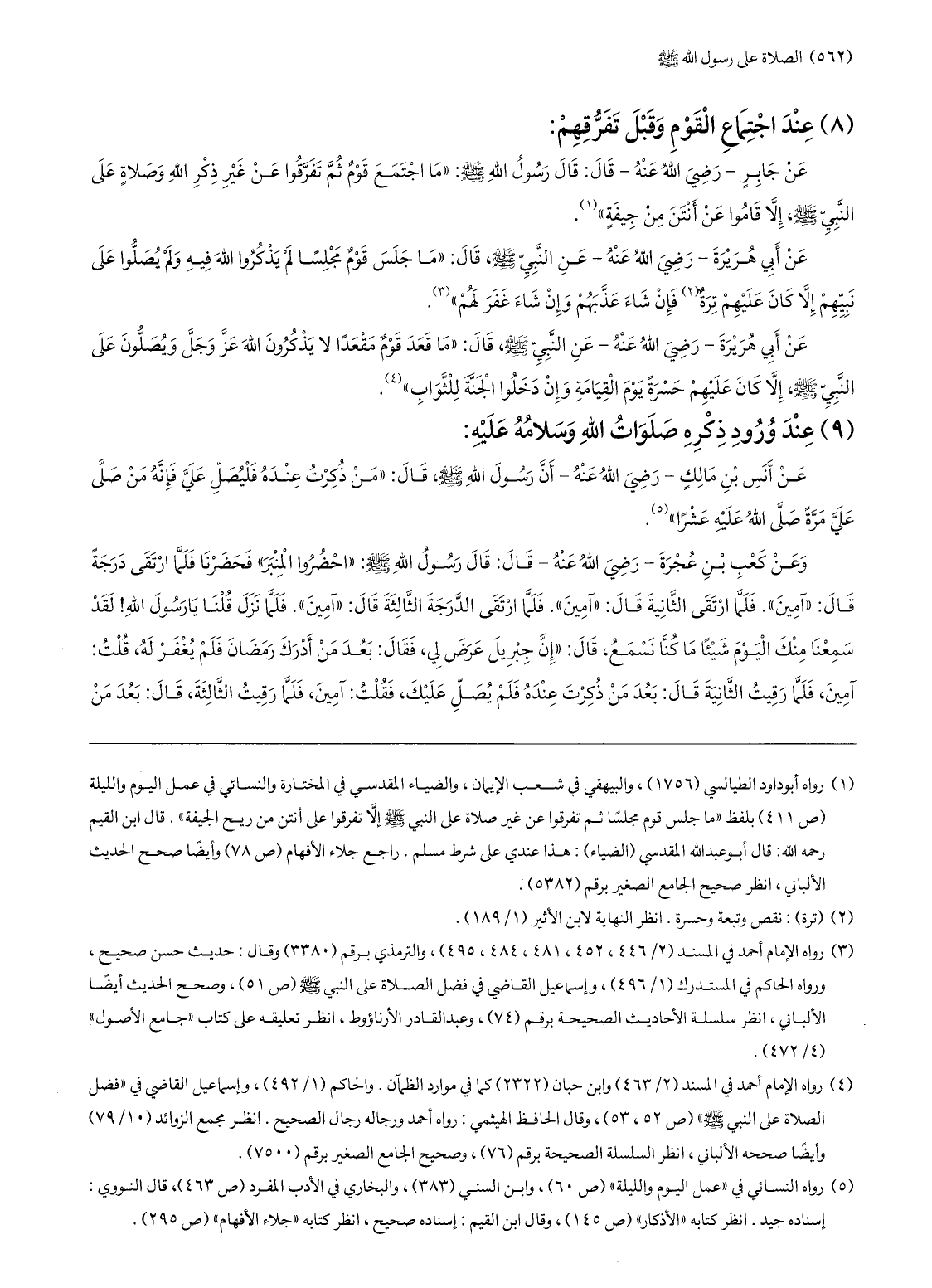 عن جابر- رضي الله عنه- قال: قال رسول الله صلّى الله عليه وسلّم: «ما اجتمع قوم ثمّ تفرّقوا عن غير ذكر الله وصلاة على النّبيّ صلّى الله عليه وسلّم، إلّا قاموا عن أنتن من جيفة» » .