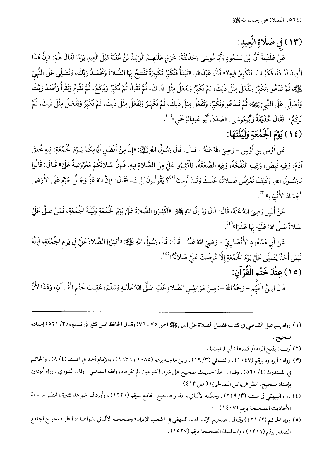 عن أبي مسعود الأنصاريّ- رضي الله عنه- قال: قال رسول الله صلّى الله عليه وسلّم: «أكثروا الصّلاة عليّ في يوم الجمعة، فإنّه ليس أحد يصلّي عليّ يوم الجمعة إلّا عرضت عليّ صلاته» «5» .