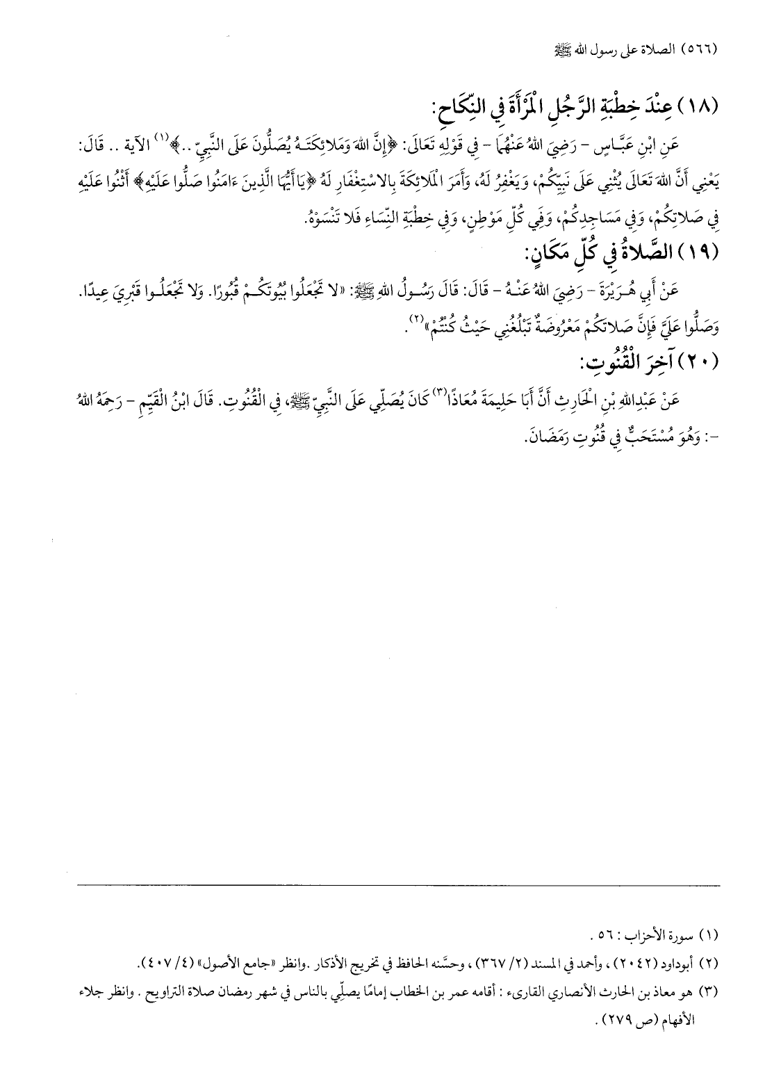 عن عبد الله بن الحارث أنّ أبا حليمة معاذا «3» كان يصلّي على النّبيّ صلّى الله عليه وسلّم، في القنوت. قال ابن القيّم- رحمه الله-: وهو مستحبّ في قنوت رمضان.