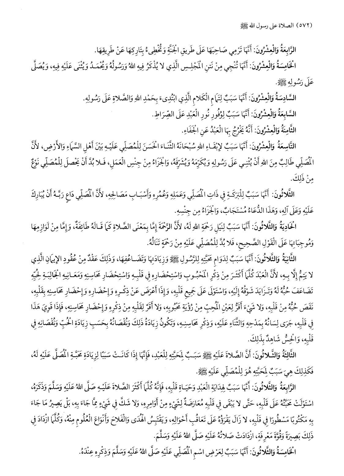 الرّابعة والثّلاثون: أنّها سبب لهداية العبد وحياة قلبه، فإنّه كلّما أكثر الصّلاة عليه صلّى الله عليه وسلّم وذكره، استولت محبّته على قلبه، حتّى لا يبقى في قلبه معارضة لشيء من أوامره، ولا شكّ في شيء ممّا جاء به، بل يصير ما جاء به مكتوبا مسطورا في قلبه، لا زال يقرؤه على تعاقب أحواله، ويقتبس الهدى والفلاح وأنواع العلوم منه، وكلّما ازداد في ذلك بصيرة وقوّة معرفة، ازدادت صلاته عليه صلّى الله عليه وسلّم.