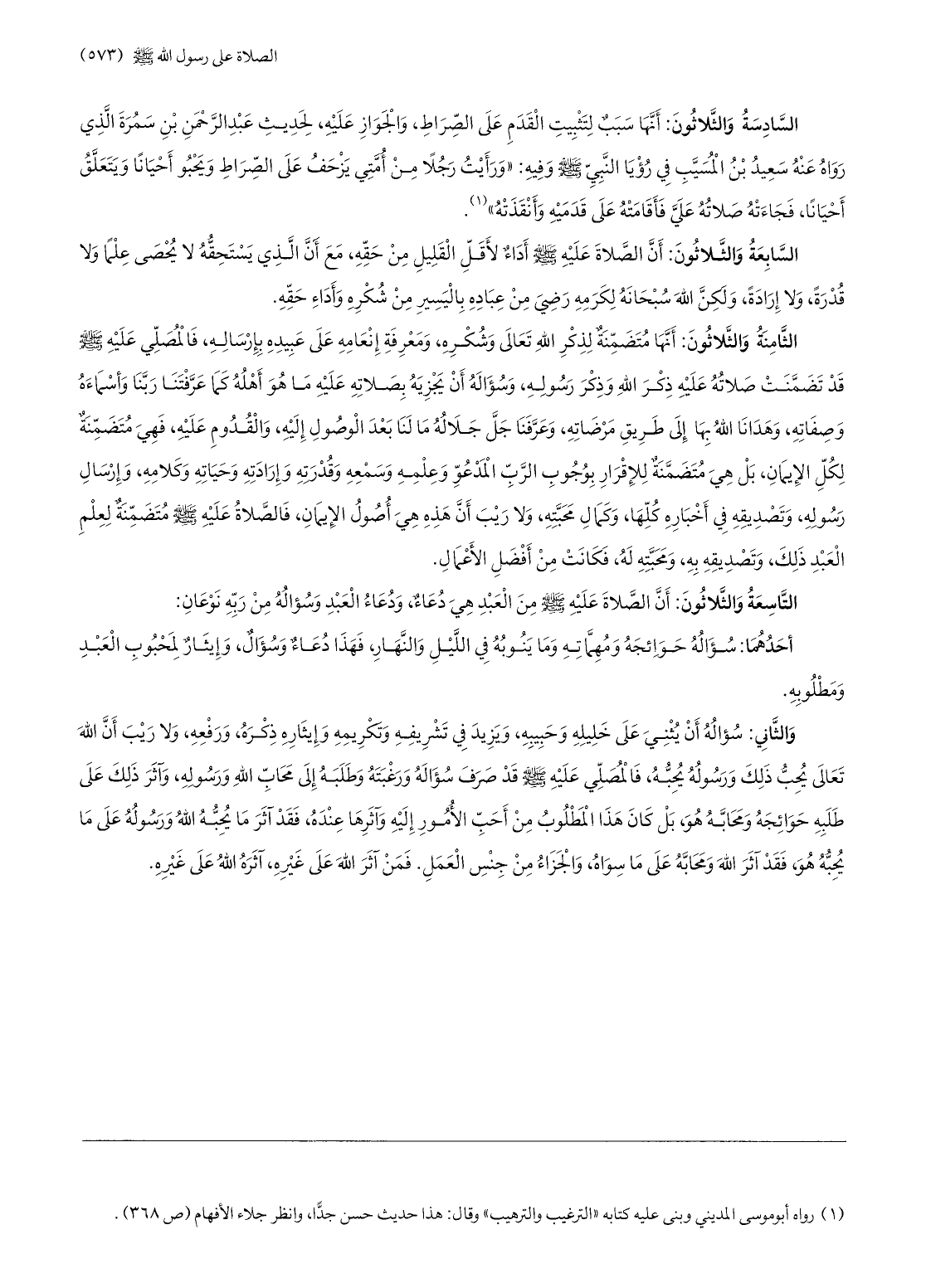 السّادسة والثّلاثون: أنّها سبب لتثبيت القدم على الصّراط، والجواز عليه، لحديث عبد الرّحمن بن سمرة الّذي رواه عنه سعيد بن المسيّب في رؤيا النّبيّ صلّى الله عليه وسلّم وفيه: «ورأيت رجلا من أمّتي يزحف على الصّراط ويحبو أحيانا ويتعلّق أحيانا، فجاءته صلاته عليّ فأقامته على قدميه وأنقذته» «1» .