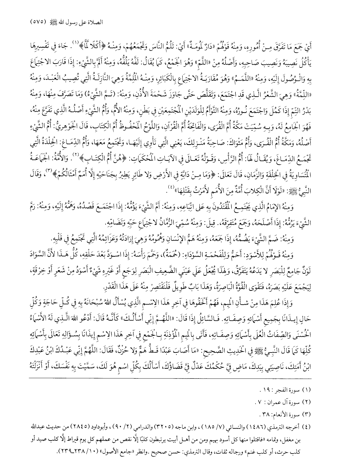 شعثه» أي جمع ما تفرّق من أموره، ومنه قولهم «دار لمومة» أي: تلمّ النّاس وتجمعهم، ومنه أَكْلًا لَمًّا «1» . جاء في تفسيرها يأكل نصيبه ونصيب صاحبه، وأصله من «اللّمّ» وهو الجمع، كما يقال: لفّه يلفّه، ومنه ألمّ بالشّيء: إذا قارب الاجتماع به والوصول إليه، ومنه «اللّمم» وهو مقاربة الاجتماع بالكبائر، ومنه الملمّة وهي النّازلة الّتي تصيب العبد، ومنه «اللّمّة» وهي الشّعر الّذي قد اجتمع، وتقلّص حتّى جاوز شحمة الأذن، ومنه: (تمّ الشّيء) وما تصرّف منها، ومنه بدر التّمّ إذا كمل واجتمع نوره، ومنه التّوأم للولدين المجتمعين في بطن، ومنه الأمّ، وأمّ الشّيء أصله الّذي تفرّع منه، فهو الجامع له، وبه سمّيت مكّة أمّ القرى، والفاتحة أمّ القرآن، واللّوح المحفوظ أمّ الكتاب، قال الجوهريّ: أمّ الشّيء أصله، ومكّة أمّ القرى، وأمّ مثواك: صاحبة منزلك، يعني الّتي تأوي إليها، وتجتمع معها، وأمّ الدّماغ: الجلدة الّتي تجمع الدّماغ، ويقال لها: أمّ الرأس، وقوله تعالى في الآيات المحكمات: