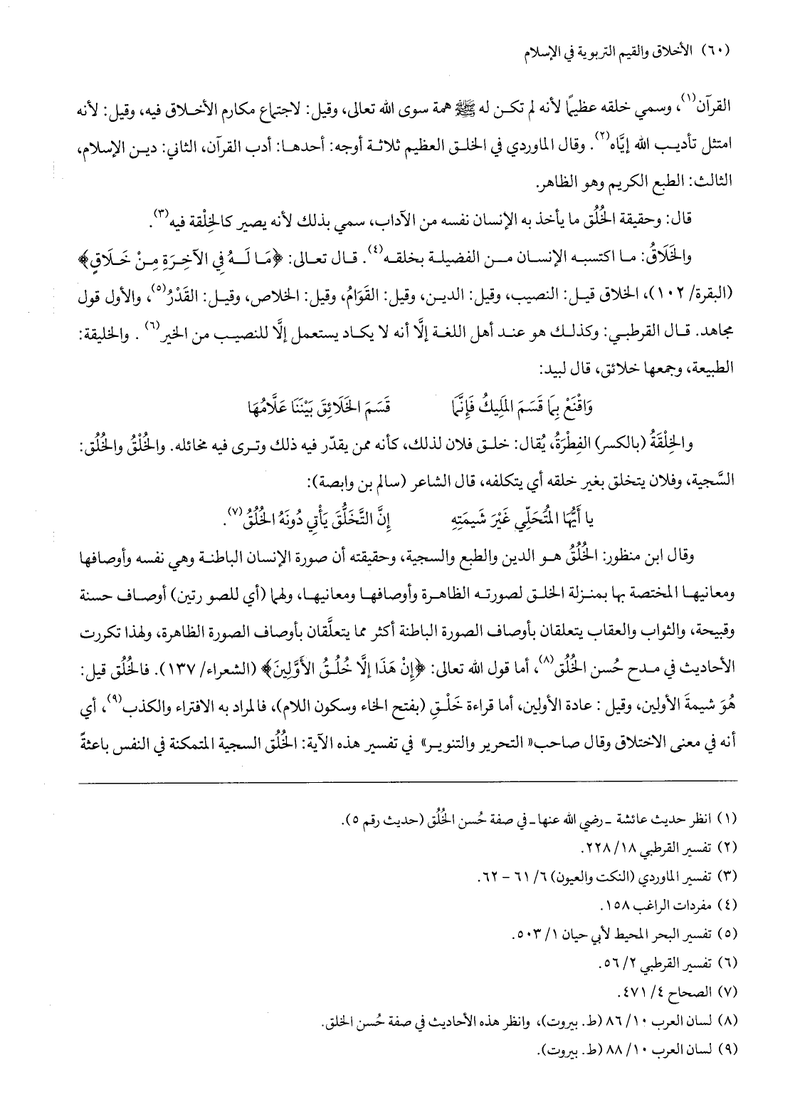 وقال ابن منظور: الخلق هو الدين والطبع والسجية، وحقيقته أن صورة الإنسان الباطنة وهي نفسه وأوصافها ومعانيها المختصة بها بمنزلة الخلق لصورته الظاهرة وأوصافها ومعانيها، ولهما (أي للصورتين) أوصاف حسنة وقبيحة، والثواب والعقاب يتعلقان بأوصاف الصورة الباطنة أكثر مما يتعلّقان بأوصاف الصورة الظاهرة، ولهذا تكررت الأحاديث في مدح حسن الخلق «8» ، أما قول الله تعالى: إِنْ هذا إِلَّا خُلُقُ الْأَوَّلِينَ (الشعراء/ 137) . فالخلق قيل: هو شيمة الأولين، وقيل: عادة الأولين، أما قراءة خلق (بفتح الخاء وسكون اللام) ، فالمراد به الافتراء والكذب «9» ، أي أنه في معنى الاختلاق وقال صاحب «التحرير والتنوير» في تفسير هذه الآية: الخلق السجية المتمكنة في النفس باعثة على عمل يناسبها من خير أو شر، وتشمل طبائع الخير وطبائع الشر ولذلك لا