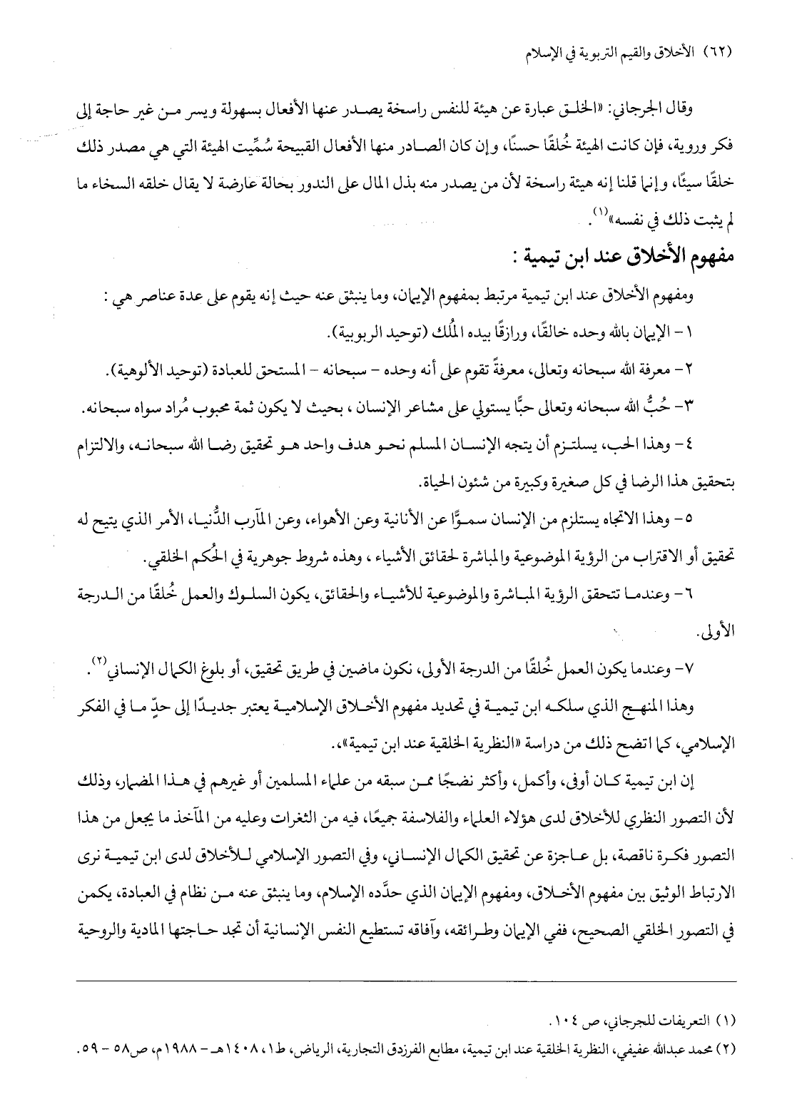 (2) محمد عبد الله عفيفي، النظرية الخلقية عند ابن تيمية، مطابع الفرزدق التجارية، الرياض، ط 1، 1408 هـ- 1988 م، ص 58- 59.