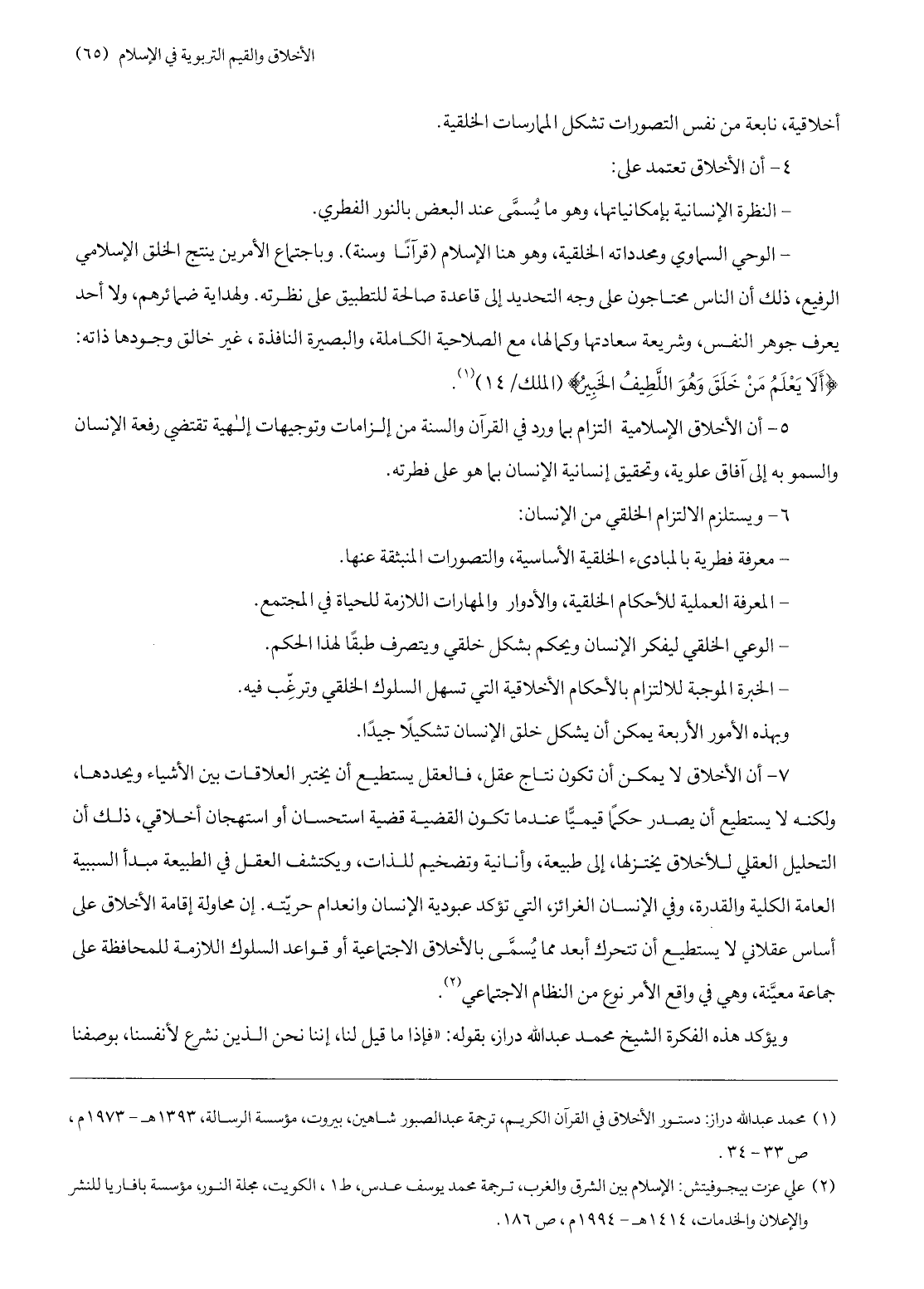 (1) محمد عبد الله دراز: دستور الأخلاق في القرآن الكريم، ترجمة عبد الصبور شاهين، بيروت، مؤسسة الرسالة، 1393 هـ- 1973 م، ص 33- 34.