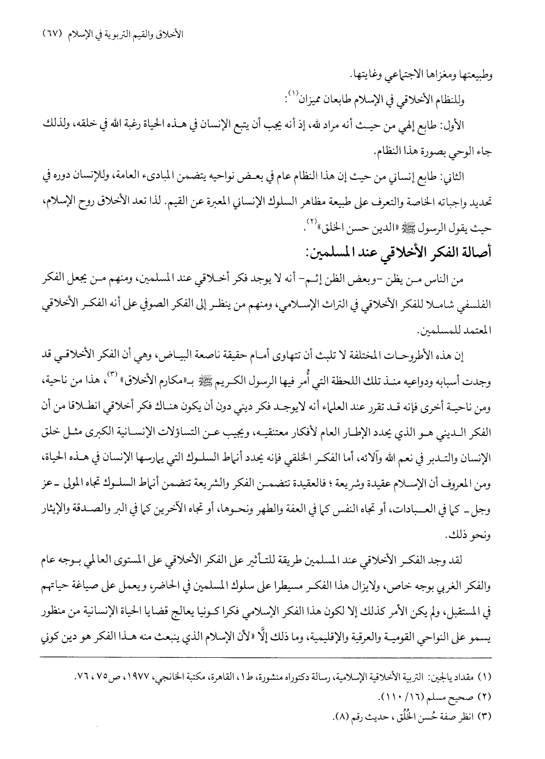 (1) مقداد يالجين: التربية الأخلاقية الإسلامية، رسالة دكتوراه منشورة، ط 1، القاهرة، مكتبة الخانجي، 1977، ص 75، 76.