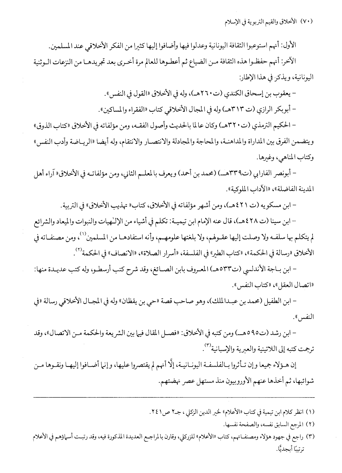 - أبو نصر الفارابي (ت 339 هـ) (محمد بن أحمد) ويعرف بالمعلم الثاني، ومن مؤلفاته في الأخلاق «آراء أهل المدينة الفاضلة» ، «الآداب الملوكية» .