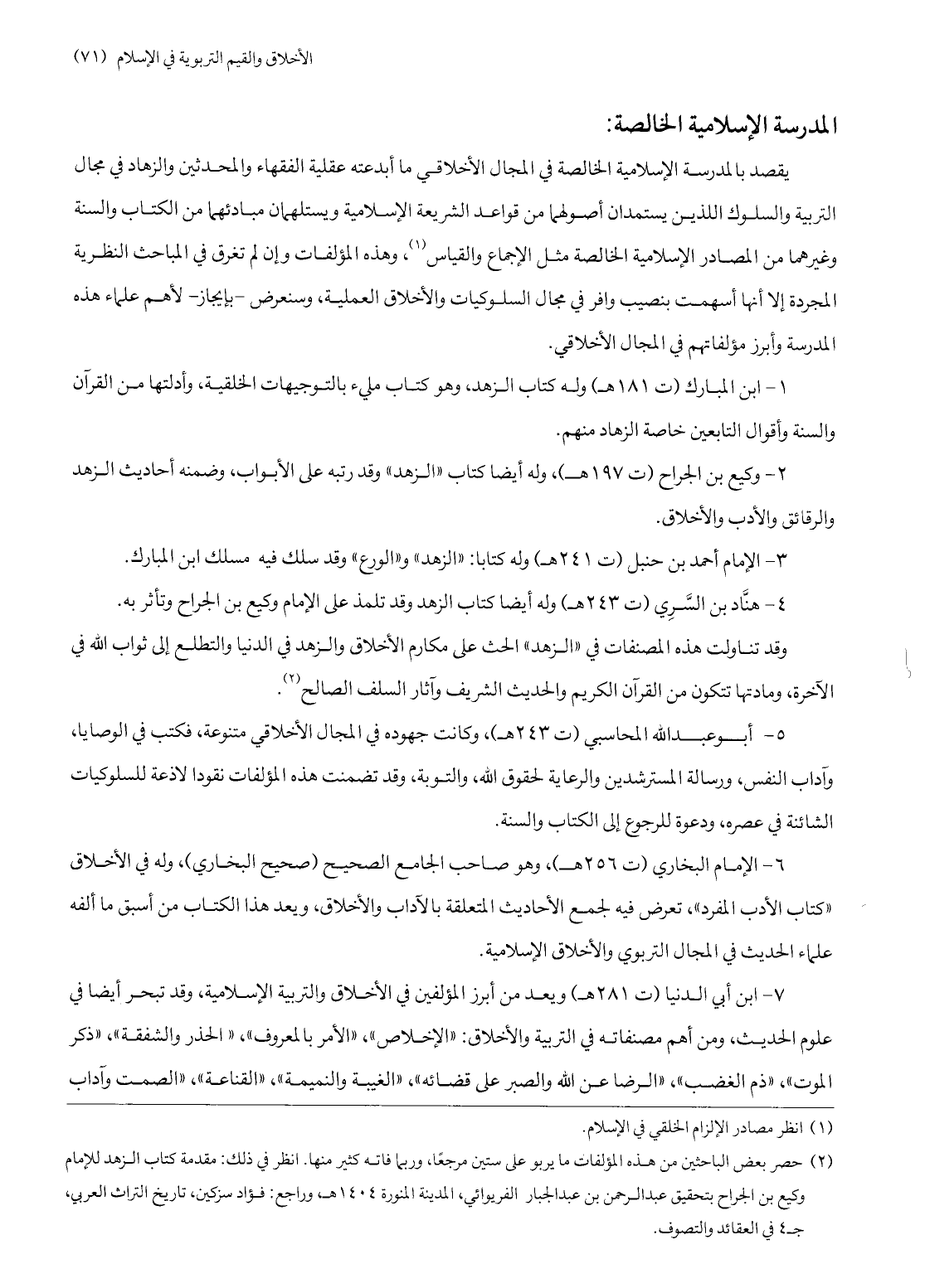 يقصد بالمدرسة الإسلامية الخالصة في المجال الأخلاقي ما أبدعته عقلية الفقهاء والمحدثين والزهاد في مجال التربية والسلوك اللذين يستمدان أصولهما من قواعد الشريعة الإسلامية ويستلهمان مبادئهما من الكتاب والسنة وغيرهما من المصادر الإسلامية الخالصة مثل الإجماع والقياس «1» ، وهذه المؤلفات وإن لم تغرق في المباحث النظرية المجردة إلا أنها أسهمت بنصيب وافر في مجال السلوكيات والأخلاق العملية، وسنعرض- بإيجاز- لأهم علماء هذه المدرسة وأبرز مؤلفاتهم في المجال الأخلاقي.