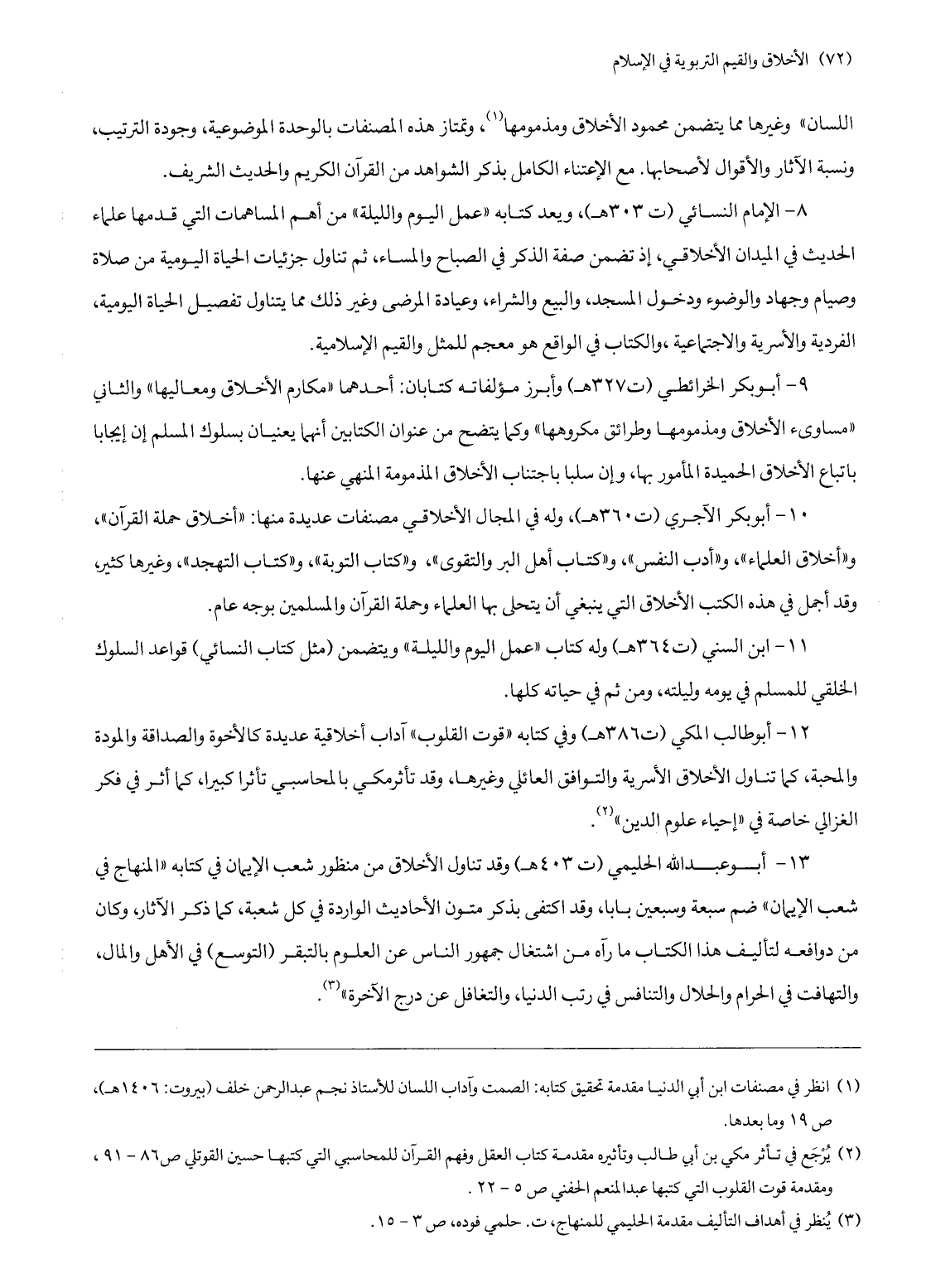 8- الإمام النسائي (ت 303 هـ) ، ويعد كتابه «عمل اليوم والليلة» من أهم المساهمات التي قدمها علماء الحديث في الميدان الأخلاقي، إذ تضمن صفة الذكر في الصباح والمساء، ثم تناول جزئيات الحياة اليومية من صلاة وصيام وجهاد والوضوء ودخول المسجد، والبيع والشراء، وعيادة المرضى وغير ذلك مما يتناول تفصيل الحياة اليومية، الفردية والأسرية والاجتماعية، والكتاب في الواقع هو معجم للمثل والقيم الإسلامية.