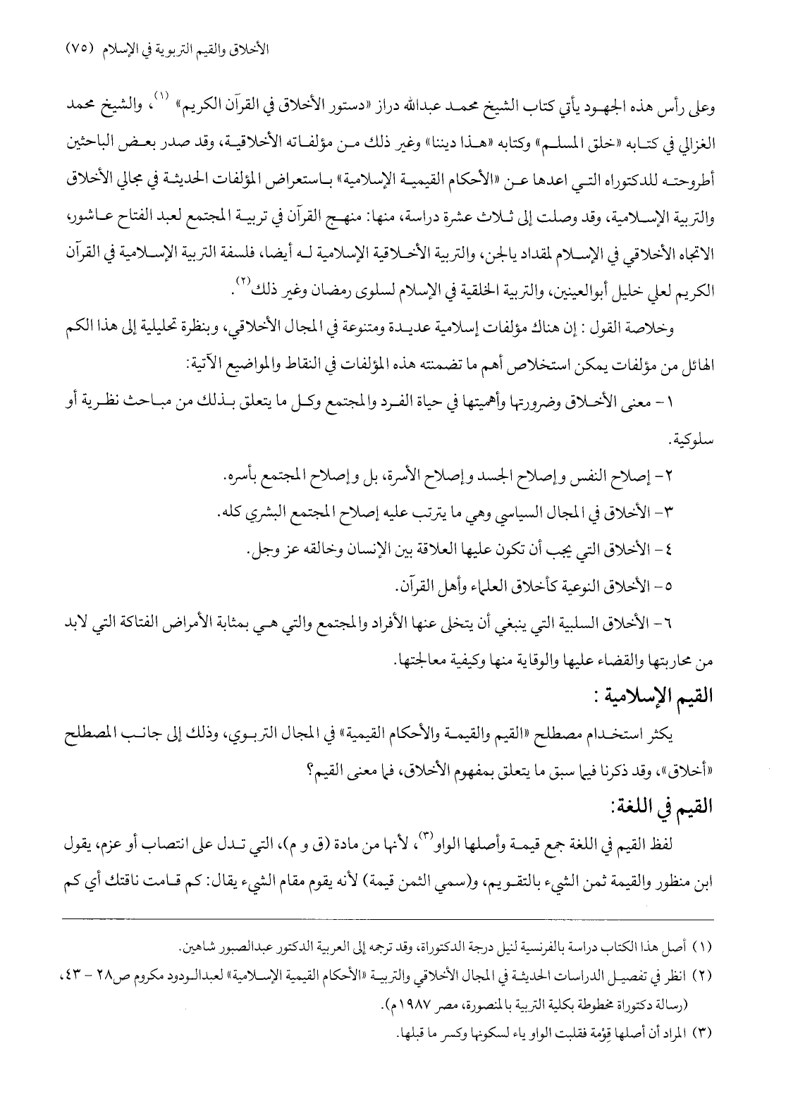 (2) انظر في تفصيل الدراسات الحديثة في المجال الأخلاقي والتربية «الأحكام القيمية الإسلامية» لعبد الودود مكروم ص 28- 43، (رسالة دكتوراة مخطوطة بكلية التربية بالمنصورة، مصر 1987 م) .