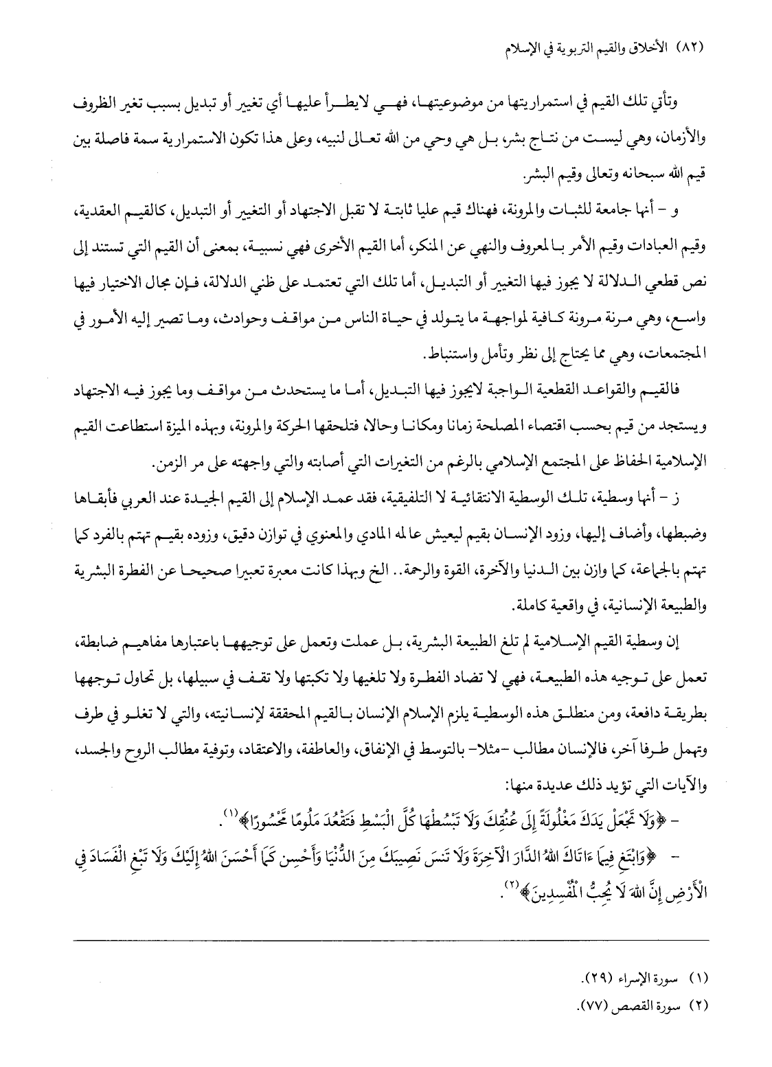وأنها جامعة للثبات والمرونة، فهناك قيم عليا ثابتة لا تقبل الاجتهاد أو التغيير أو التبديل، كالقيم العقدية، وقيم العبادات وقيم الأمر بالمعروف والنهي عن المنكر، أما القيم الأخرى فهي نسبية، بمعنى أن القيم التي تستند إلى نص قطعي الدلالة لا يجوز فيها التغيير أو التبديل، أما تلك التي تعتمد على ظني الدلالة، فإن مجال الاختيار فيها واسع، وهي مرنة مرونة كافية لمواجهة ما يتولد في حياة الناس من مواقف وحوادث، وما تصير إليه الأمور في المجتمعات، وهي مما يحتاج إلى نظر وتأمل واستنباط.