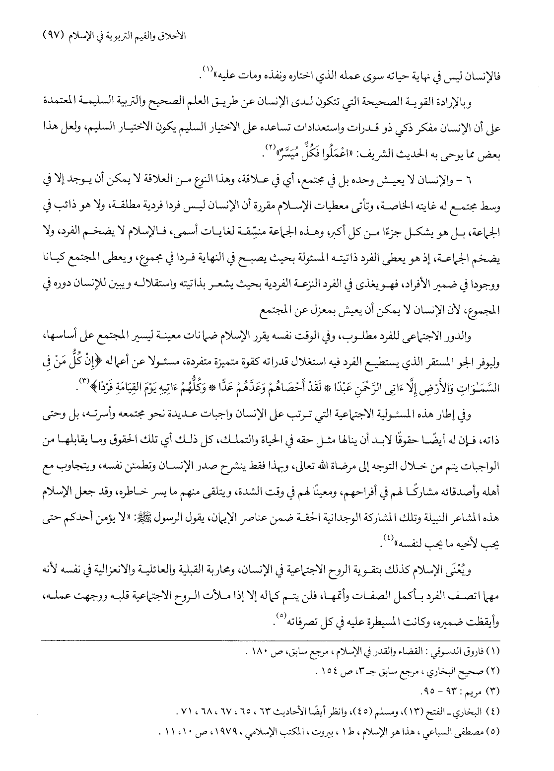 والدور الاجتماعى للفرد مطلوب، وفي الوقت نفسه يقرر الإسلام ضمانات معينة ليسير المجتمع على أساسها، وليوفر الجو المستقر الذي يستطيع الفرد فيه استغلال قدراته كقوة متميزة متفردة، مسئولا عن أعماله إِنْ كُلُّ مَنْ فِي السَّماواتِ وَالْأَرْضِ إِلَّا آتِي الرَّحْمنِ عَبْداً* لَقَدْ أَحْصاهُمْ وَعَدَّهُمْ عَدًّا* وَكُلُّهُمْ آتِيهِ يَوْمَ الْقِيامَةِ فَرْداً «3» .