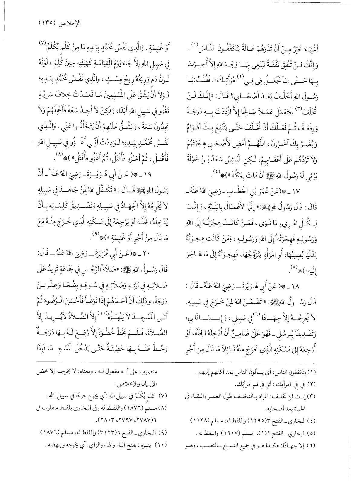 19-* (عن أبي هريرة- رضي الله عنه- أنّ رسول الله صلّى الله عليه وسلّم قال: «تكفّل الله لمن جاهد في سبيله لا يخرجه إلّا الجهاد في سبيله وتصديق كلماته بأن يدخله الجنّة أو يرجعه إلى مسكنه الّذي خرج منه مع ما نال من أجر أو غنيمة» ) * «9» .