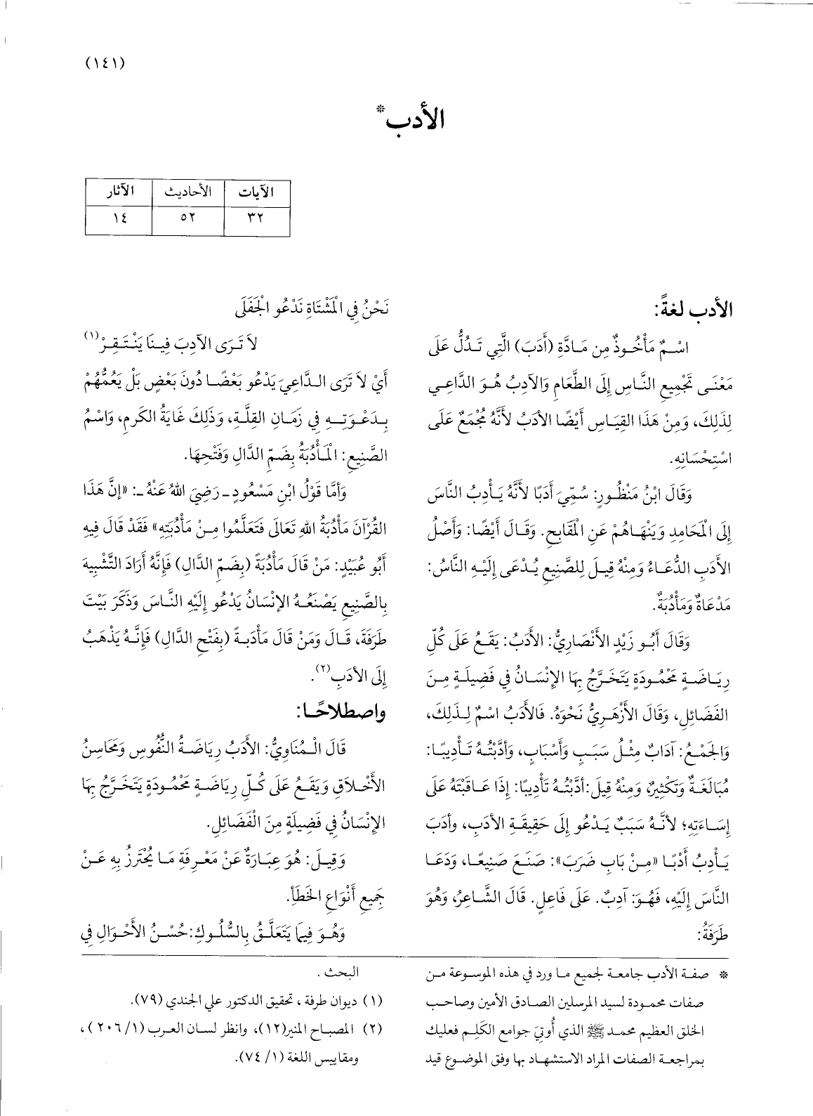 وأمّا قول ابن مسعود- رضي الله عنه-: «إنّ هذا القرآن مأدبة الله تعالى فتعلّموا من مأدبته» فقد قال فيه أبو عبيد: من قال مأدبة (بضمّ الدّال) فإنّه أراد التّشبيه بالصّنيع يصنعه الإنسان يدعو إليه النّاس وذكر بيت طرفة، قال ومن قال مأدبة (بفتح الدّال) فإنّه يذهب إلى الأدب «2» .