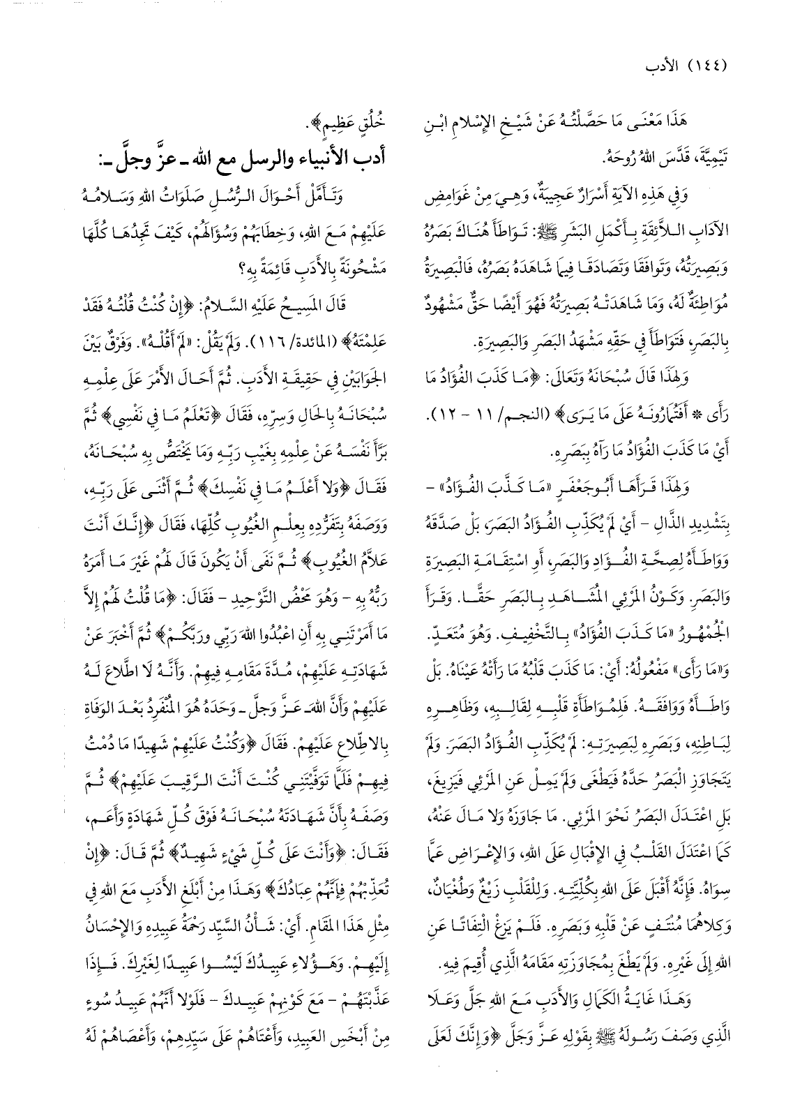قال المسيح عليه السّلام: إِنْ كُنْتُ قُلْتُهُ فَقَدْ عَلِمْتَهُ (المائدة/ 116) . ولم يقل: «لم أقله» . وفرق بين الجوابين في حقيقة الأدب. ثمّ أحال الأمر على علمه سبحانه بالحال وسرّه، فقال تَعْلَمُ ما فِي نَفْسِي ثمّ برّأ نفسه عن علمه بغيب ربّه وما يختصّ به سبحانه، فقال وَلا أَعْلَمُ ما فِي نَفْسِكَ ثمّ أثنى على ربّه، ووصفه بتفرّده بعلم الغيوب كلّها، فقال إِنَّكَ أَنْتَ عَلَّامُ الْغُيُوبِ ثمّ نفى أن يكون قال لهم غير ما أمره ربّه به وهو محض التّوحيد- فقال: ما قُلْتُ لَهُمْ إِلَّا ما أَمَرْتَنِي بِهِ أَنِ اعْبُدُوا اللَّهَ رَبِّي وَرَبَّكُمْ ثمّ أخبر عن شهادته عليهم، مدّة مقامه فيهم. وأنّه لا اطّلاع له عليهم وأنّ الله- عزّ وجلّ- وحده هو المنفرد بعد الوفاة بالاطّلاع عليهم. فقال وَكُنْتُ عَلَيْهِمْ شَهِيداً ما دُمْتُ فِيهِمْ فَلَمَّا تَوَفَّيْتَنِي كُنْتَ أَنْتَ الرَّقِيبَ عَلَيْهِمْ ثمّ وصفه بأنّ شهادته سبحانه فوق كلّ شهادة وأعم، فقال: وَأَنْتَ عَلى كُلِّ شَيْءٍ شَهِيدٌ ثمّ قال: إِنْ تُعَذِّبْهُمْ فَإِنَّهُمْ عِبادُكَ وهذا من أبلغ الأدب مع الله في مثل هذا المقام. أي: شأن السّيّد رحمة عبيده والإحسان إليهم. وهؤلاء عبيدك ليسوا عبيدا لغيرك. فإذا عذّبتهم مع كونهم عبيدك- فلولا أنّهم عبيد سوء من أبخس العبيد، وأعتاهم على سيّدهم، وأعصاهم له لم