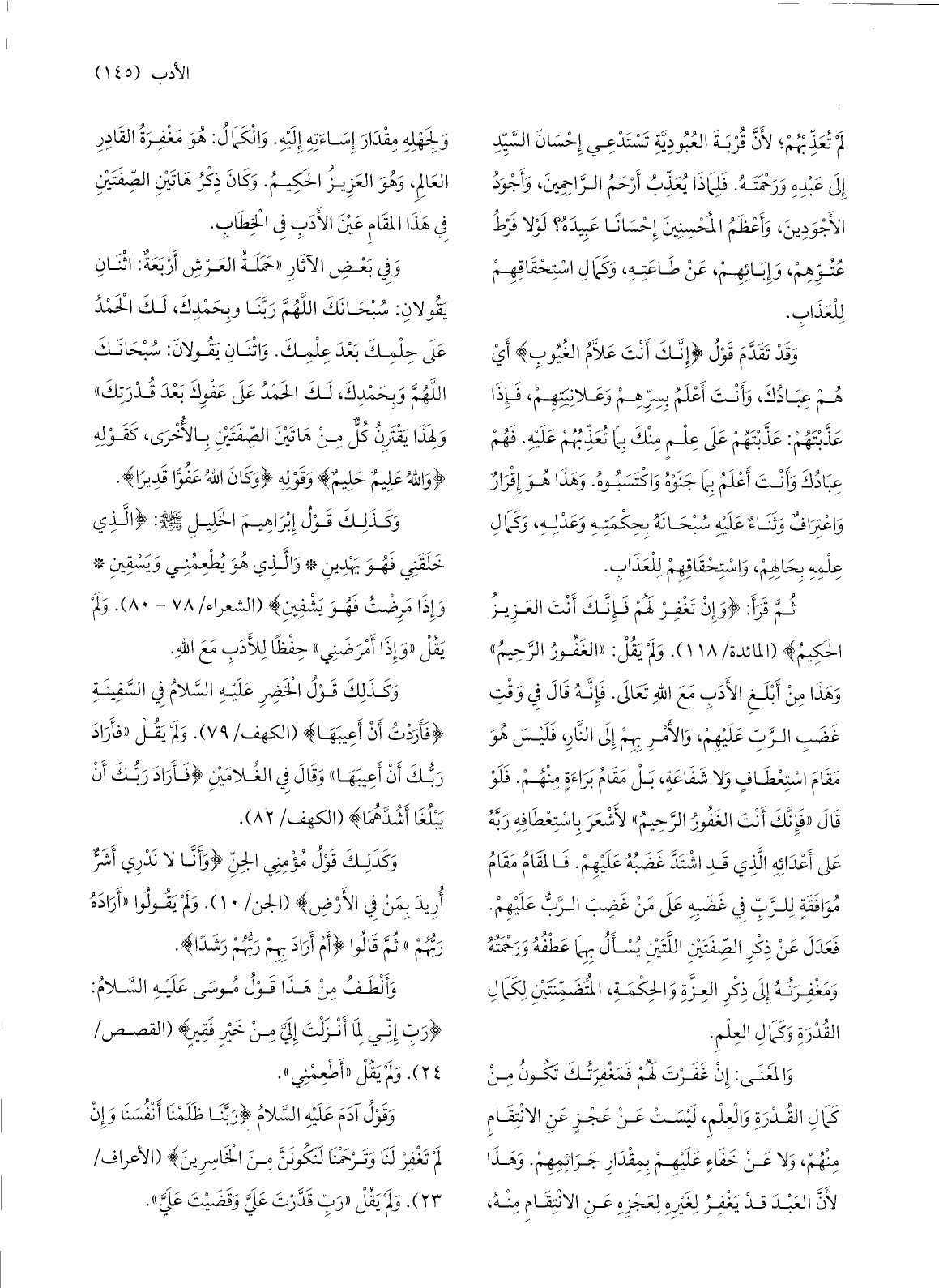 ثمّ قرأ: وَإِنْ تَغْفِرْ لَهُمْ فَإِنَّكَ أَنْتَ الْعَزِيزُ الْحَكِيمُ (المائدة/ 118) . ولم يقل: «الغفور الرّحيم» وهذا من أبلغ الأدب مع الله تعالى. فإنّه قال في وقت غضب الرّبّ عليهم، والأمر بهم إلى النّار، فليس هو مقام استعطاف ولا شفاعة، بل مقام براءة منهم. فلو قال «فإنّك أنت الغفور الرّحيم» لأشعر باستعطافه ربّه على أعدائه الّذي قد اشتدّ غضبه عليهم. فالمقام مقام موافقة للرّبّ في غضبه على من غضب الرّبّ عليهم. فعدل عن ذكر الصّفتين اللّتين يسأل بهما عطفه ورحمته ومغفرته إلى ذكر العزّة والحكمة، المتضمّنتين لكمال القدرة وكمال العلم.