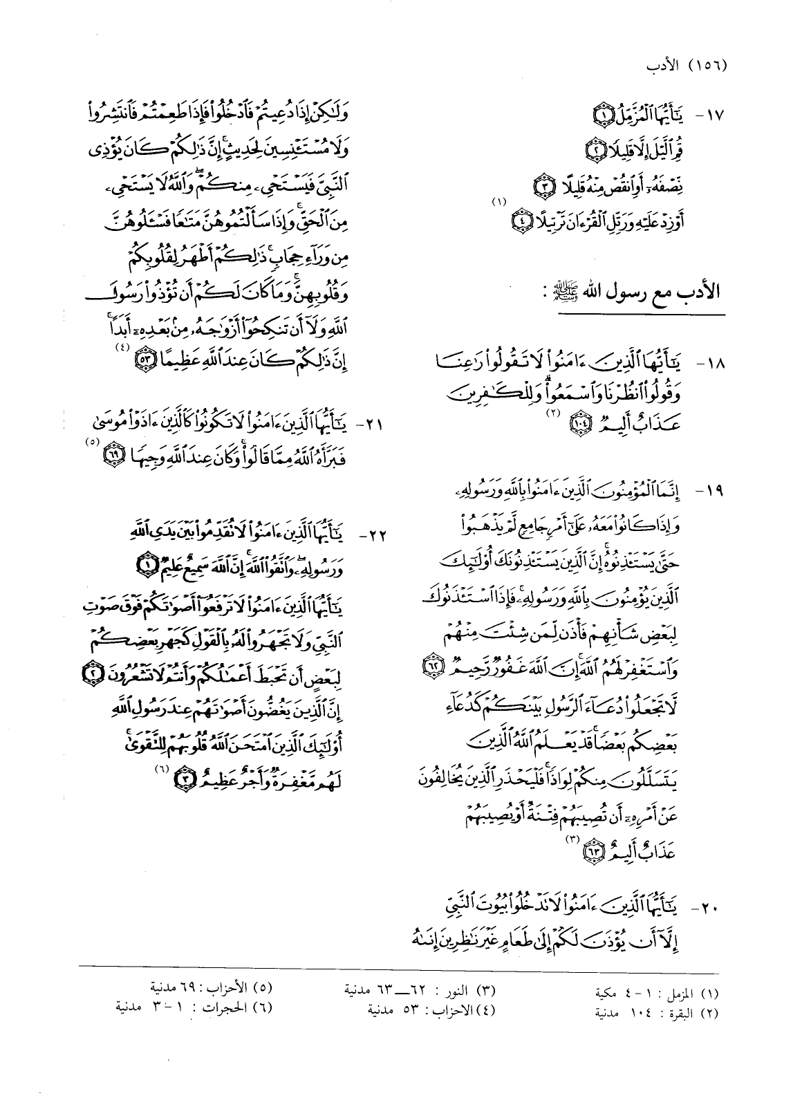 20- يا أَيُّهَا الَّذِينَ آمَنُوا لا تَدْخُلُوا بُيُوتَ النَّبِيِّ إِلَّا أَنْ يُؤْذَنَ لَكُمْ إِلى طَعامٍ غَيْرَ ناظِرِينَ إِناهُ وَلكِنْ إِذا دُعِيتُمْ فَادْخُلُوا فَإِذا طَعِمْتُمْ فَانْتَشِرُوا وَلا مُسْتَأْنِسِينَ لِحَدِيثٍ إِنَّ ذلِكُمْ كانَ يُؤْذِي النَّبِيَّ فَيَسْتَحْيِي مِنْكُمْ وَاللَّهُ لا يَسْتَحْيِي مِنَ الْحَقِّ وَإِذا سَأَلْتُمُوهُنَّ مَتاعاً فَسْئَلُوهُنَّ مِنْ وَراءِ حِجابٍ ذلِكُمْ أَطْهَرُ لِقُلُوبِكُمْ وَقُلُوبِهِنَّ وَما كانَ لَكُمْ أَنْ تُؤْذُوا رَسُولَ اللَّهِ وَلا أَنْ تَنْكِحُوا أَزْواجَهُ مِنْ بَعْدِهِ أَبَداً إِنَّ ذلِكُمْ كانَ عِنْدَ اللَّهِ عَظِيماً (53) «4»