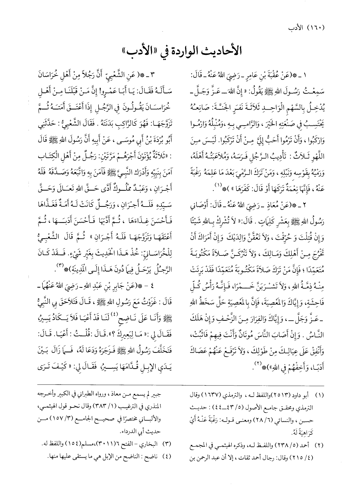 3-* (عن الشّعبيّ أنّ رجلا من أهل خراسان سألة فقال: يا أبا عمرو! إنّ من قبلنا من أهل خراسان يقولون في الرّجل إذا أعتق أمته ثمّ تزوّجها: فهو كالرّاكب بدنته. فقال الشّعبيّ: حدّثني أبو بردة بن أبي موسى، عن أبيه أنّ رسول الله صلّى الله عليه وسلّم قال: «ثلاثة يؤتون أجرهم مرّتين: رجل من أهل الكتاب آمن بنبيّه وأدرك النّبيّ صلّى الله عليه وسلّم فآمن به واتّبعه وصدّقه فله أجران، وعبد مملوك أدّى حقّ الله تعالى وحقّ سيّده فله أجران، ورجل كانت له أمة فغذّاها فأحسن غذاءها، ثمّ أدّبها فأحسن أدبها، ثمّ أعتقها وتزوّجها فله أجران» ثمّ قال الشّعبيّ للخراسانيّ: