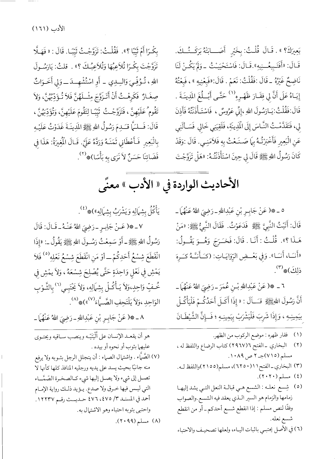 7-* (عن جابر- رضي الله عنه- قال: قال رسول الله صلّى الله عليه وسلّم- أو سمعت رسول الله صلّى الله عليه وسلّم يقول: «إذا انقطع شسع أحدكم- أو من انقطع شسع نعله «5» فلا يمش في نعل واحدة حتّى يصلح شسعه، ولا يمش في خفّ واحد، ولا يأكل بشماله، ولا يحتبي «6» بالثّوب الواحد، ولا يلتحف الصّمّاء «7» » ) * «8» .