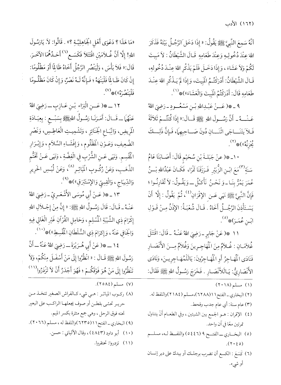 12-* (عن البراء بن عازب- رضي الله عنهما- قال: أمرنا رسول الله صلّى الله عليه وسلّم بسبع: بعيادة المريض، واتّباع الجنائز، وتشميت العاطس، ونصر الضّعيف، وعون المظلوم، وإفشاء السّلام، وإبرار المقسم. ونهى عن الشّرب في الفضّة، ونهى عن تختّم الذّهب، وعن ركوب المياثر «8» ، وعن لبس الحرير والدّيباج، والقسيّ والإستبرق» ) * «9» .