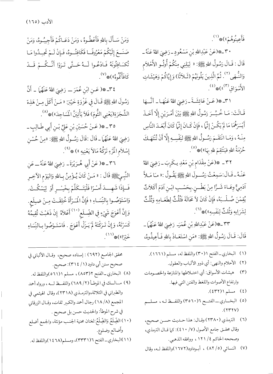 33-* (عن عبد الله بن عمر- رضي الله عنهما- قال: قال رسول الله صلّى الله عليه وسلّم: «من استعاذ بالله فأعيذوه، ومن سأل بالله فأعطوه، ومن دعاكم فأجيبوه، ومن صنع إليكم معروفا فكافئوه، فإن لم تجدوا ما تكافئونه فادعوا له حتّى تروا أنّكم قد كافأتموه» ) * «7» .