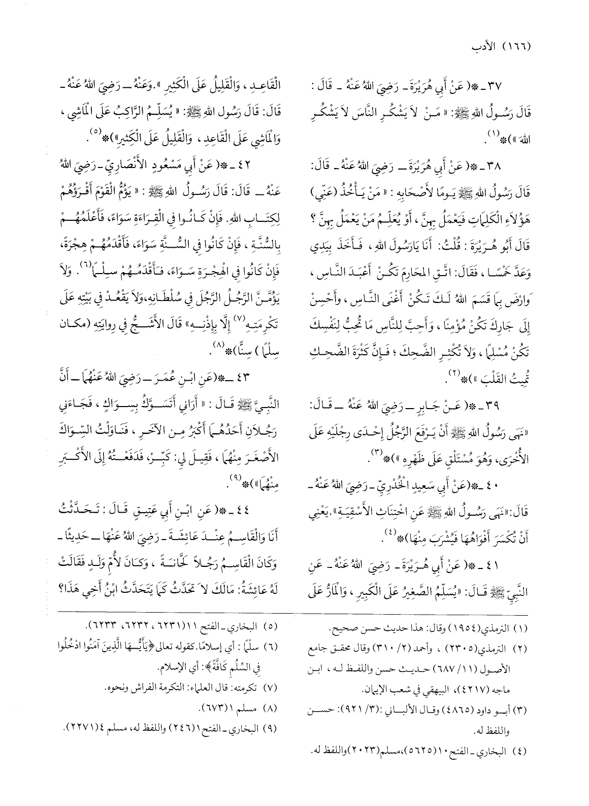41-* (عن أبي هريرة- رضي الله عنه- عن النّبيّ صلّى الله عليه وسلّم قال: «يسلّم الصّغير على الكبير، والمارّ على القاعد، والقليل على الكثير» . وعنه- رضي الله عنه- قال: قال رسول الله صلّى الله عليه وسلّم: «يسلّم الرّاكب على الماشي، والماشي على القاعد، والقليل على الكثير» ) * «5» .