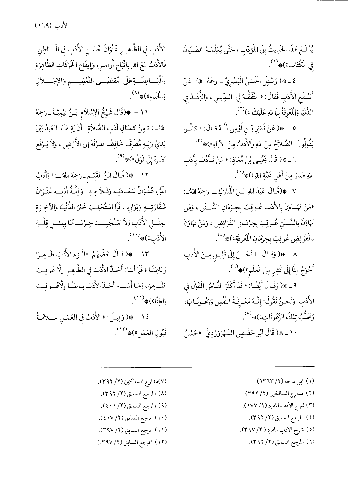 12-* (قال ابن القيّم- رحمه الله-: «وأدب المرء عنوان سعادته وفلاحه. وقلّة أدبه عنوان شقاوته وبواره، فما استجلب خير الدّنيا والآخرة بمثل الأدب ولا استجلب حرمانها بمثل قلّة الأدب» ) * «10» .