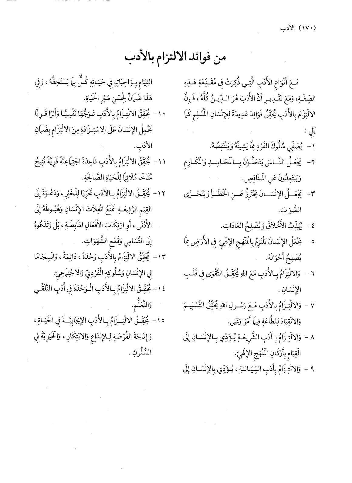 10- يحقّق الالتزام بالأدب توجّها نفسيّا وأثرا قويّا يحمل الإنسان على الاستزادة من الالتزام بضمان الأدب.