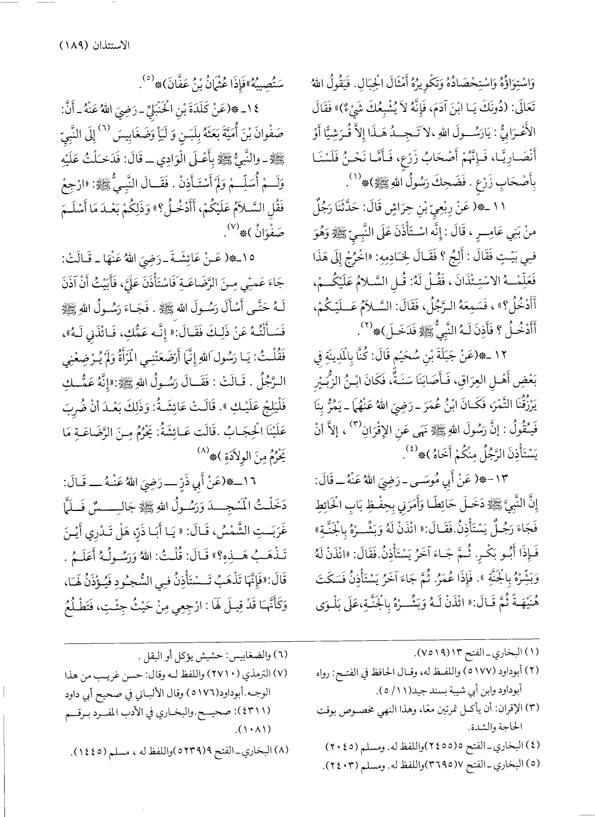 11-* (عن ربعيّ بن حراش قال: حدّثنا رجل من بني عامر، قال: إنّه استأذن على النّبيّ صلّى الله عليه وسلّم وهو في بيت فقال: ألج؟ فقال لخادمه: «اخرج إلى هذا فعلّمه الاستئذان، فقل له: قل السّلام عليكم، أأدخل؟» ، فسمعه الرّجل، فقال: السّلام عليكم، أأدخل؟ فأذن له النّبيّ صلّى الله عليه وسلّم فدخل) * «2» .
