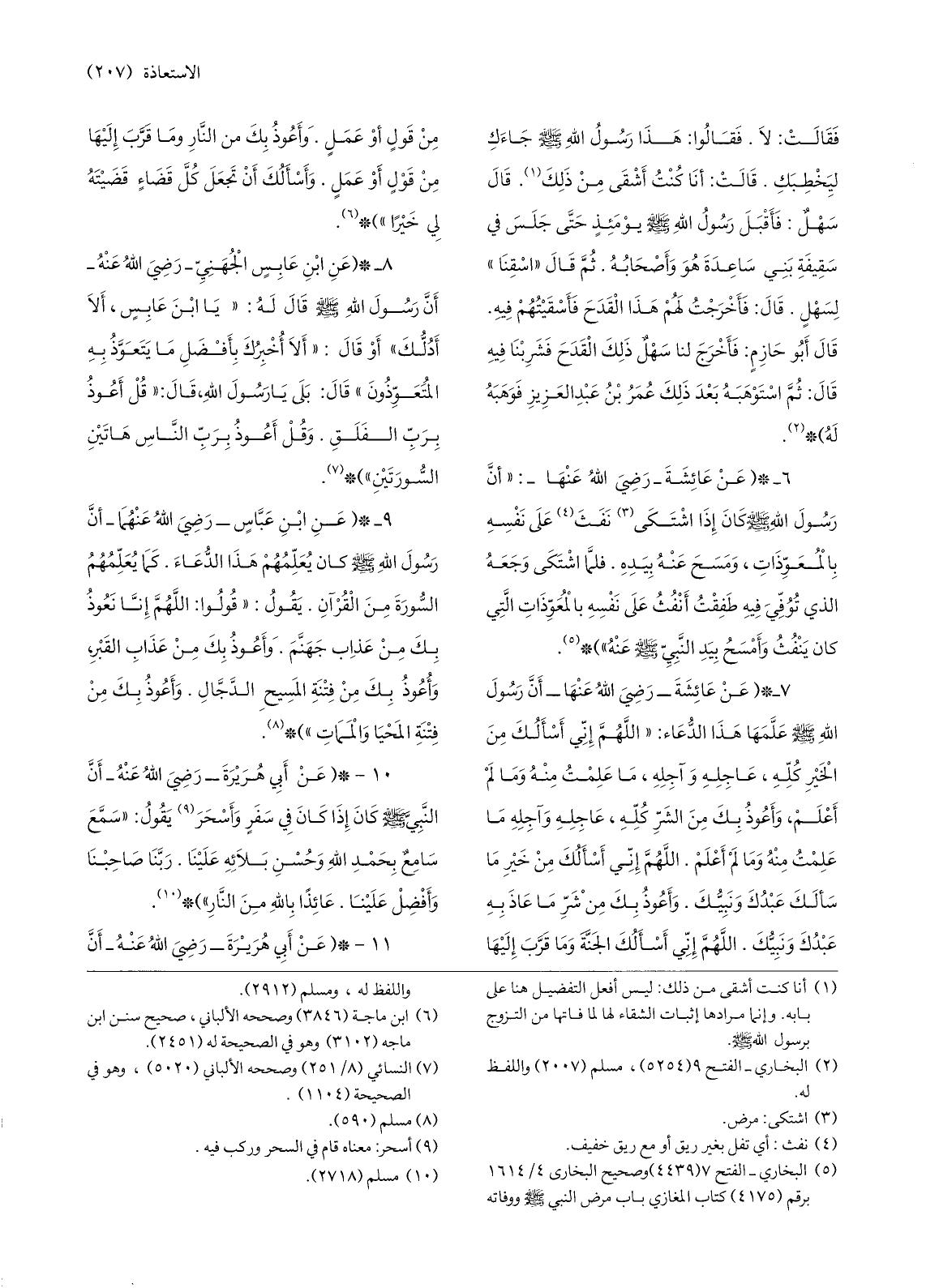 9-* (عن ابن عبّاس- رضي الله عنهما- أنّ رسول الله صلّى الله عليه وسلّم كان يعلّمهم هذا الدّعاء. كما يعلّمهم السّورة من القرآن. يقول: «قولوا: اللهمّ إنّا نعوذ بك من عذاب جهنّم. وأعوذ بك من عذاب القبر، وأعوذ بك من فتنة المسيح الدّجّال. وأعوذ بك من فتنة المحيا والممات» ) * «8» .