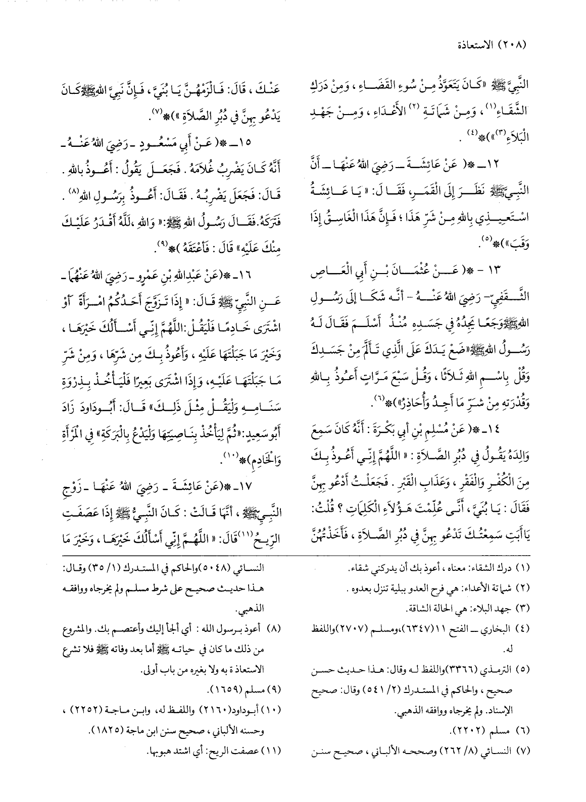 13-* (عن عثمان بن أبي العاص الثّقفيّ- رضي الله عنه- أنّه شكا إلى رسول الله صلّى الله عليه وسلّم وجعا يجده في جسده منذ أسلم فقال له رسول الله صلّى الله عليه وسلّم «ضع يدك على الّذي تألّم من جسدك وقل باسم الله ثلاثا، وقل سبع مرّات أعوذ بالله وقدرته من شرّ ما أجد وأحاذر» ) * «6» .