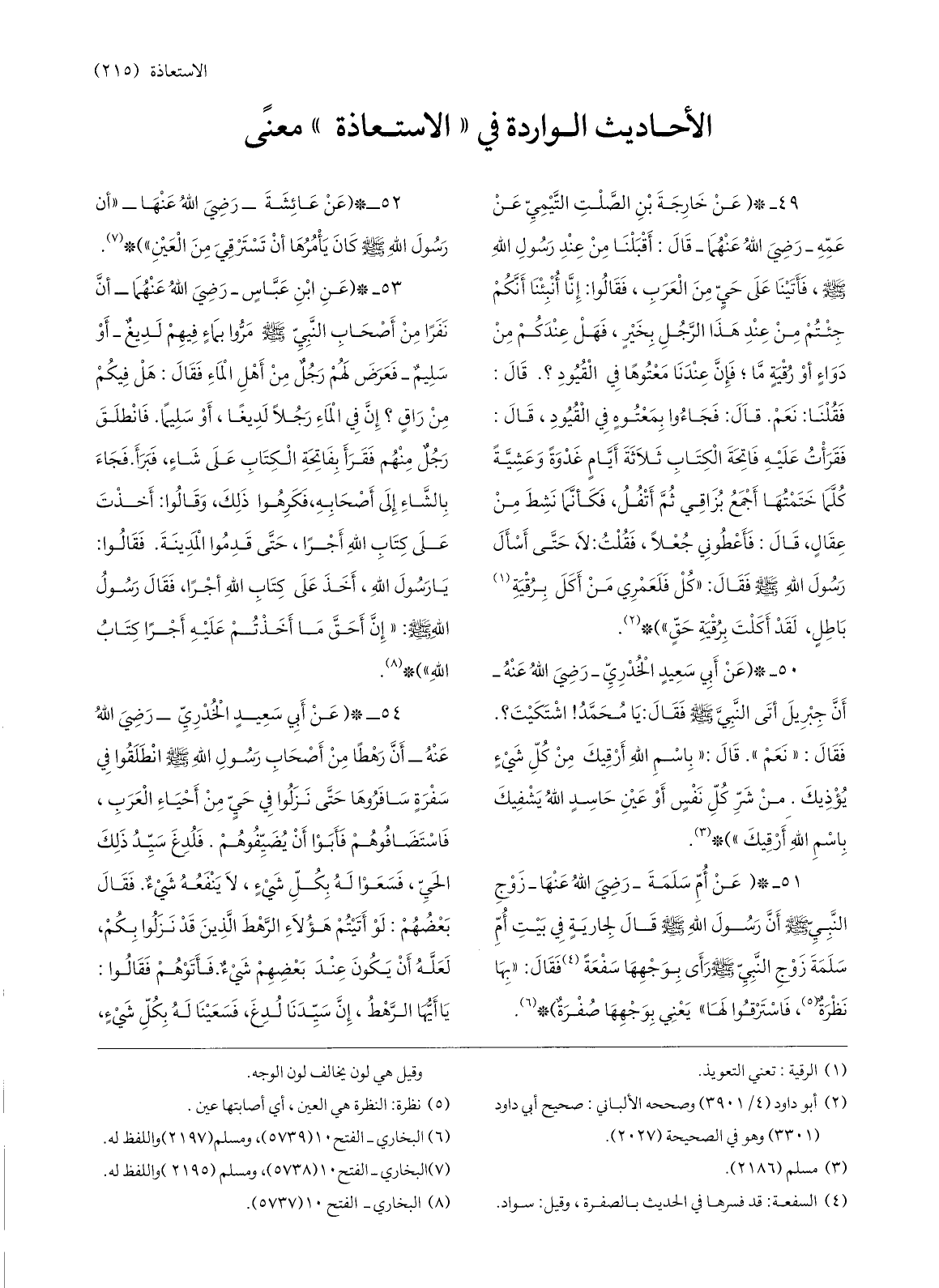 50-* (عن أبي سعيد الخدريّ- رضي الله عنه- أنّ جبريل أتى النّبيّ صلّى الله عليه وسلّم فقال: يا محمّد! اشتكيت؟. فقال: «نعم» . قال: «باسم الله أرقيك من كلّ شيء يؤذيك. من شرّ كلّ نفس أو عين حاسد الله يشفيك باسم الله أرقيك» ) * «3» .