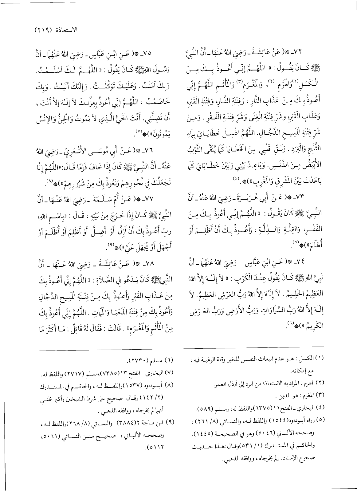 73-* (عن أبي هريرة- رضي الله عنه- أنّ النّبيّ صلّى الله عليه وسلّم كان يقول: «اللهمّ إنّي أعوذ بك من الفقر، والقلّة والذّلّة، وأعوذ بك أن أظلم أو أظلم» ) * «5» .