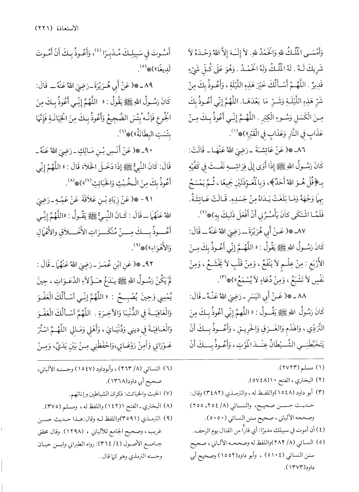 87-* (عن أبي هريرة- رضي الله عنه- قال: كان رسول الله صلّى الله عليه وسلّم يقول: «اللهمّ إنّي أعوذ بك من الأربع: من علم لا ينفع، ومن قلب لا يخشع، ومن نفس لا تشبع، ومن دعاء لا يسمع» ) * «3» .