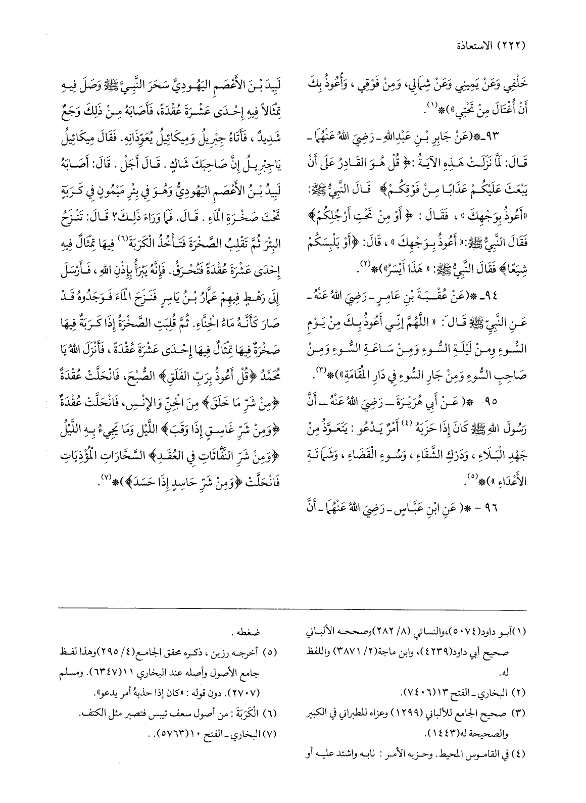 96-* (عن ابن عبّاس- رضي الله عنهما- أنّ لبيد بن الأعصم اليهوديّ سحر النّبيّ صلّى الله عليه وسلّم وصل فيه تمثالا فيه إحدى عشرة عقدة، فأصابه من ذلك وجع شديد، فأتاه جبريل وميكائيل يعوّذانه. فقال ميكائيل يا جبريل إنّ صاحبك شاك. قال أجل. قال: