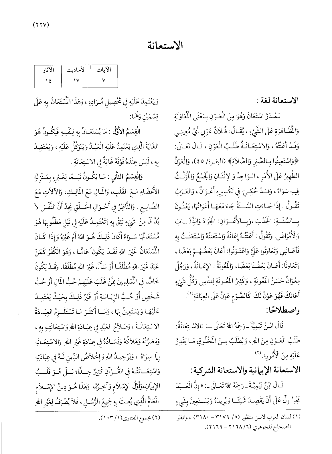 والقسم الثاّني: ما يكون تبعا لغيره بمنزلة الأعضاء مع القلب، والمال مع المالك، والآلآت مع الصّانع. والنّاظر في أحوال الخلق يجد أنّ النّفس لا بدّ لها من شيء تثق به وتعتمد عليه في نيل مطلوبها هو مستعانها سواء أكان ذلك هو الله أم غيره وإذا كان المستعان غير الله فقد يكون عامّا، وهو الكفر كمن عبد غير الله مطلقا أو سأل غير الله مطلقا. وقد يكون خاصّا في المسلمين ممّن غلب عليهم حبّ المال أو حبّ شخص أو حبّ الرّياسة أو غير ذلك بحيث يعتمد عليها ويستعين بها، وما أكثر ما تستلزم العبادة الاستعانة، وصلاح العبد في عبادة الله واستعانته به، ومضرّته وهلاكه وفساده في عبادة غير الله والاستعانة بما سواه، وتوحيد الله وإخلاص الدّين له في عبادته واستعانته في القرآن كثير جدّا؛ بل هو قلب الإيمان، وأوّل الإسلام وآخره، وهذا هو دين الإسلام العامّ الّذي بعث به جميع الرّسل، فلا يصرف لغير الله