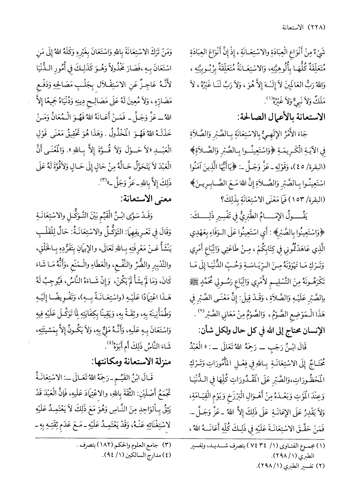 قال ابن رجب- رحمه الله تعالى-: «العبد محتاج إلى الاستعانة بالله في فعل المأمورات وترك المحظورات، والصّبر على المقدورات كلّها في الدّنيا وعند الموت وبعده من أهوال البرزخ ويوم القيامة، ولا يقدر على الإعانة على ذلك إلّا الله- عزّ وجلّ-.