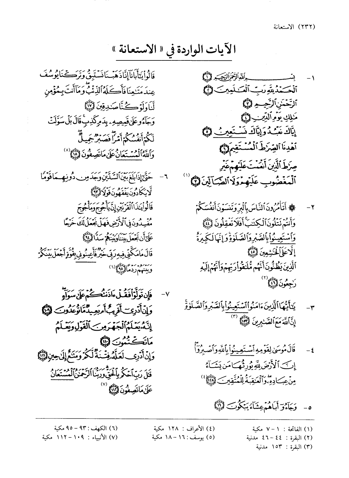 1- بِسْمِ اللَّهِ الرَّحْمنِ الرَّحِيمِ (1) الْحَمْدُ لِلَّهِ رَبِّ الْعالَمِينَ (2) الرَّحْمنِ الرَّحِيمِ (3) مالِكِ يَوْمِ الدِّينِ (4) إِيَّاكَ نَعْبُدُ وَإِيَّاكَ نَسْتَعِينُ (5) اهْدِنَا الصِّراطَ الْمُسْتَقِيمَ (6) صِراطَ الَّذِينَ أَنْعَمْتَ عَلَيْهِمْ غَيْرِ الْمَغْضُوبِ عَلَيْهِمْ وَلَا الضَّالِّينَ (7) «1»